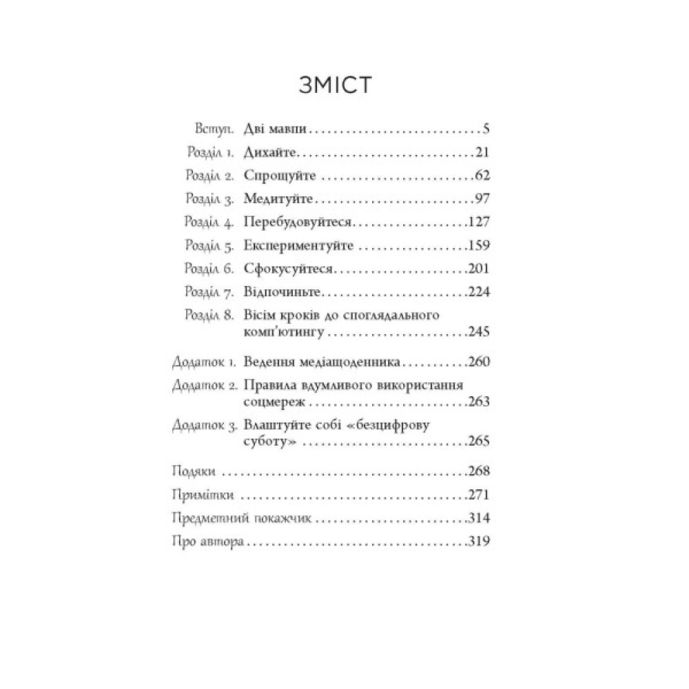 Мобільні пристрої й мережа захопили наше життя, і книжка Алекса СучжонКім Панга відкриває способи залишатися у взаємодії з ними, не зазнаючи втрат у розумових здібностях, не зменшуючи концентрації уваги та вмінь у реальному житті. Чи зможемо ми вберегти своє життя, коли щодня стаємо усе більш зайнятими і схильними відволікатися? Автор, знаний гуру у сфері технологій, відповідає: «Так!». Його книжка наповнена цікавими розвідками, захопливими дослідженнями і важливими висновками. Життєдайне чтиво для бізнес-читачів, технарів, технічнозалежних та всіх, хто хоче досягти успіху в нашому світі технологій, а також для чоловіків і дружин, друзів та рідних, які зазвичай першими розпізнають необхідність допомогти тому, хто поруч.