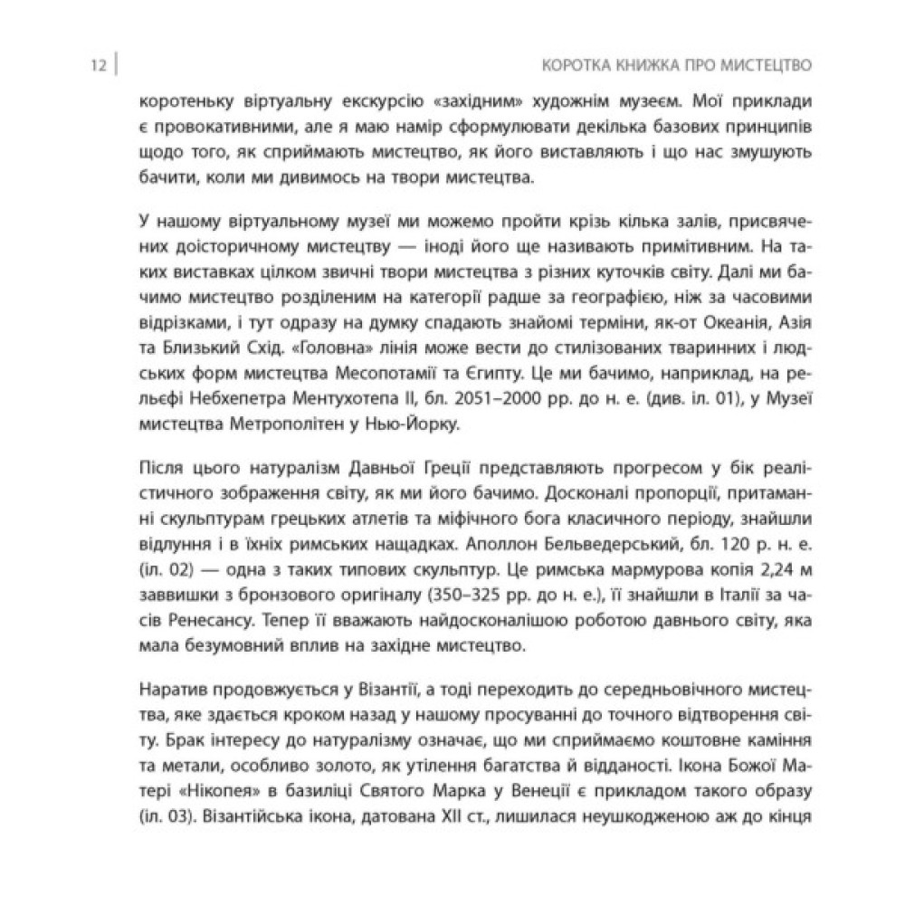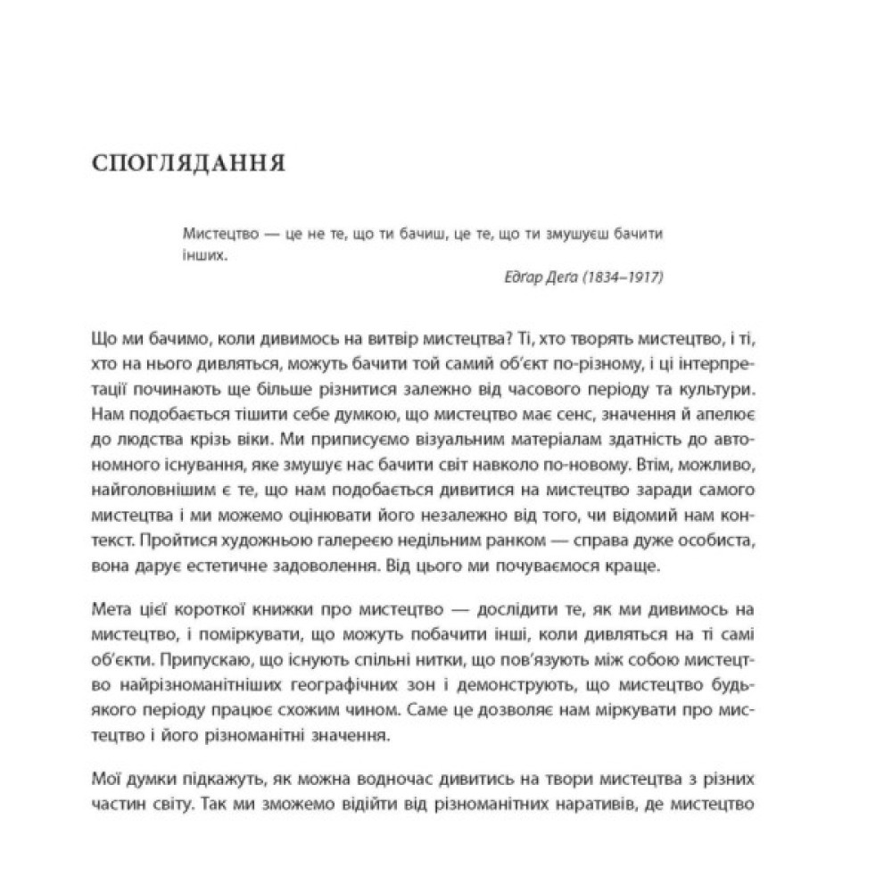 Книжка британської мистецтвознавиці Дани Арнольд — своєрідний вступ до історії мистецтва, написаний стисло і доступно. Авторка пропонує свіжий і нетривіальний погляд на твори мистецтва від печерних малюнків доісторичних людей до скандальних інсталяцій сучасних майстрів. Професорка Арнольд проводить читачів віртуальною галереєю і переконливо доводить, що будь-хто може навчитися розуміти мистецтво й отримувати насолоду від його шедеврів.