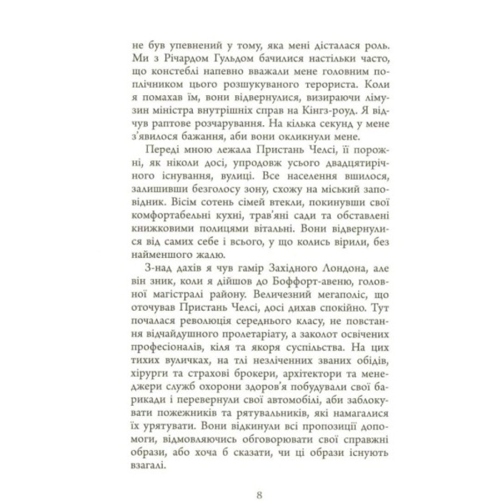 Маркхему здається, що він от-от нащупає шляхи, що ведуть до винуватців загибелі його дружини, але потроху він піддається власним прихованим пристрастям і перетворюється на одного з функціонерів таємної організації. Роман рясніє надзвичайно яскравими, суто Баллардівськими персонажами: соціопатами, симулянтами, священиками, колишніми співробітниками спецслужб, які нині займаються виготовленням бомб для терористів, лікарями, під маскою яких переховуються геть інші персони. Врешті-решт Маркхем отримує відповіді на всі свої запитання — та він і припустити не міг, що вони виявляться саме такими…