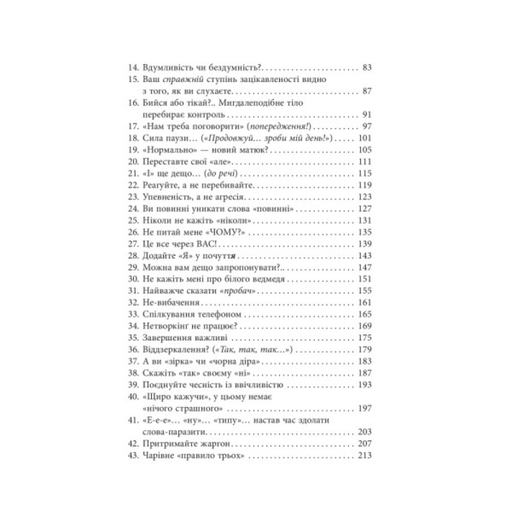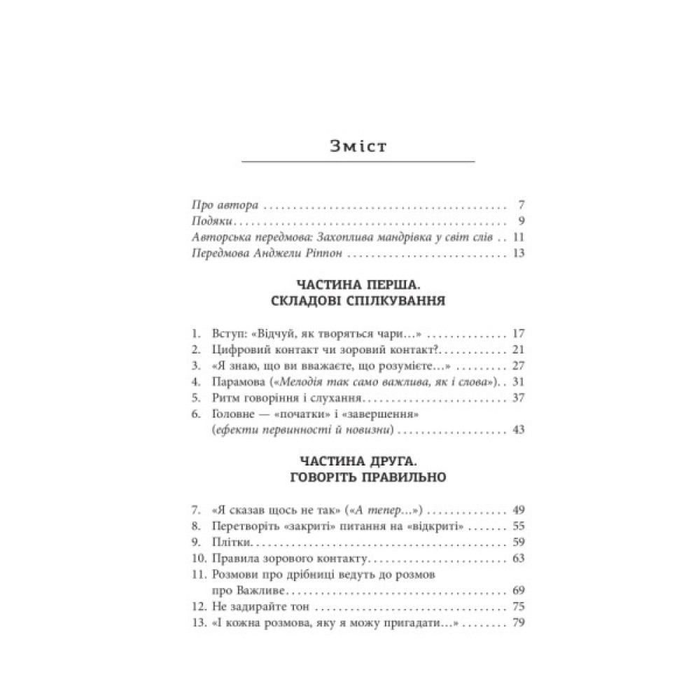 Перший розділ «Складові спілкування» охоплює ключові моменти вербальної комунікації, зокрема те, як люди закладають і розпізнають значення сказаного. Те, як співрозмовник говорить, не менш важливо за його слова, тому варто враховувати й невербальні засоби передачі інформації — жести, тон, погляд тощо. Другий розділ, «Говоріть правильно», присвячений практичному застосуванню пропонованих автором методів та охоплює широкий спектр тем, починаючи від закритих і відкритих запитань, сили паузи до важливості слухання, етикету зорового контакту, порад щодо налагодження стосунків, як розвіяти напругу та гнів, навчитися заперечувати щось, не будучи при цьому неприємними.