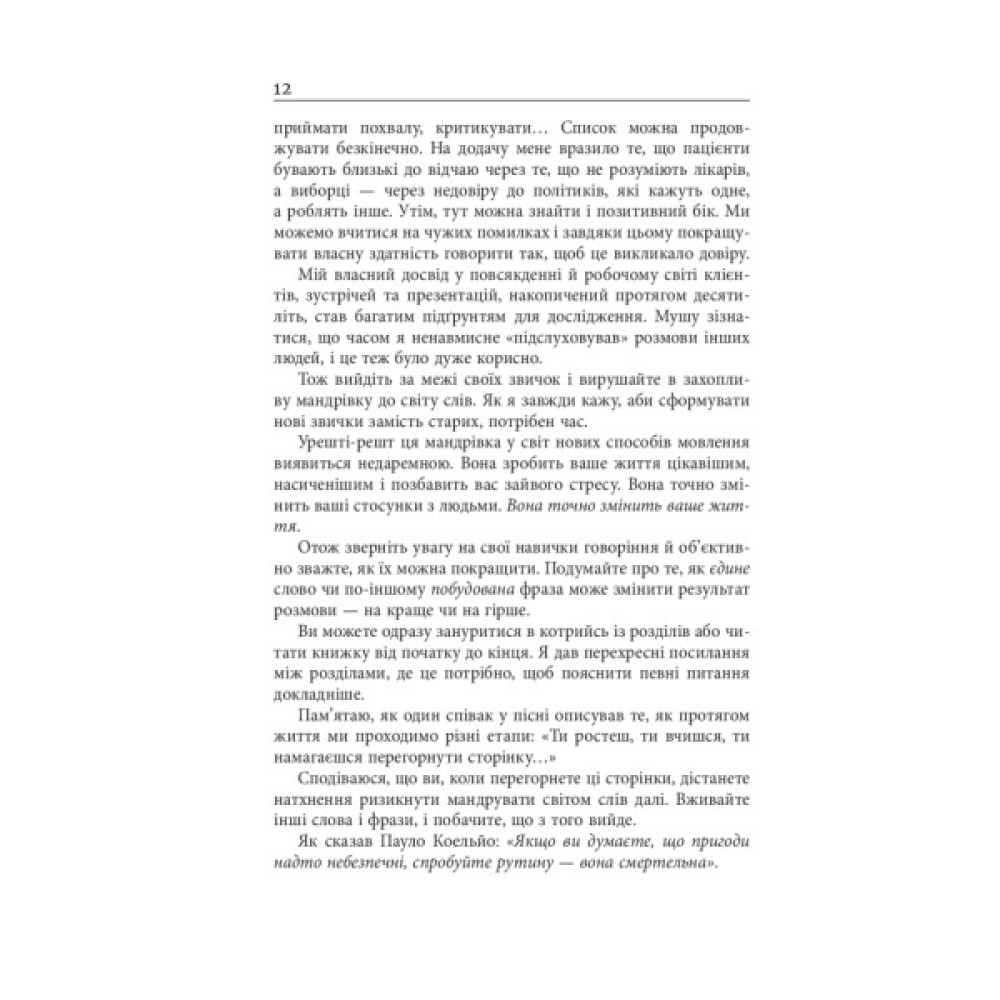 Сучасна залежність людей від месенджерів негативно впливає на навички живої комунікації. Слова мають силу як лікувати, так і шкодити, тож завжди варто стежити за своїми формулюваннями. Книга має на меті допомогти читачам опанувати мистецтво говорити й навчитися миттєво обмірковувати, що і як сказати. Автор аналізує роботу слів, позначає типові пастки, яких слід уникати, та надає безліч простих, але потужних способів покращити вербальні навички та щоденну взаємодію. Він зазначає, що для ефективного спілкування важлива не тільки мова, а й інтонація, вираз обличчя, гучність голосу, поза тіла тощо. Вміння й сміливість говорити допоможе розв'язати безліч проблем у робочих і особистих стосунках і позбутися думок, як краще було б відповісти у тій чи іншій ситуації.