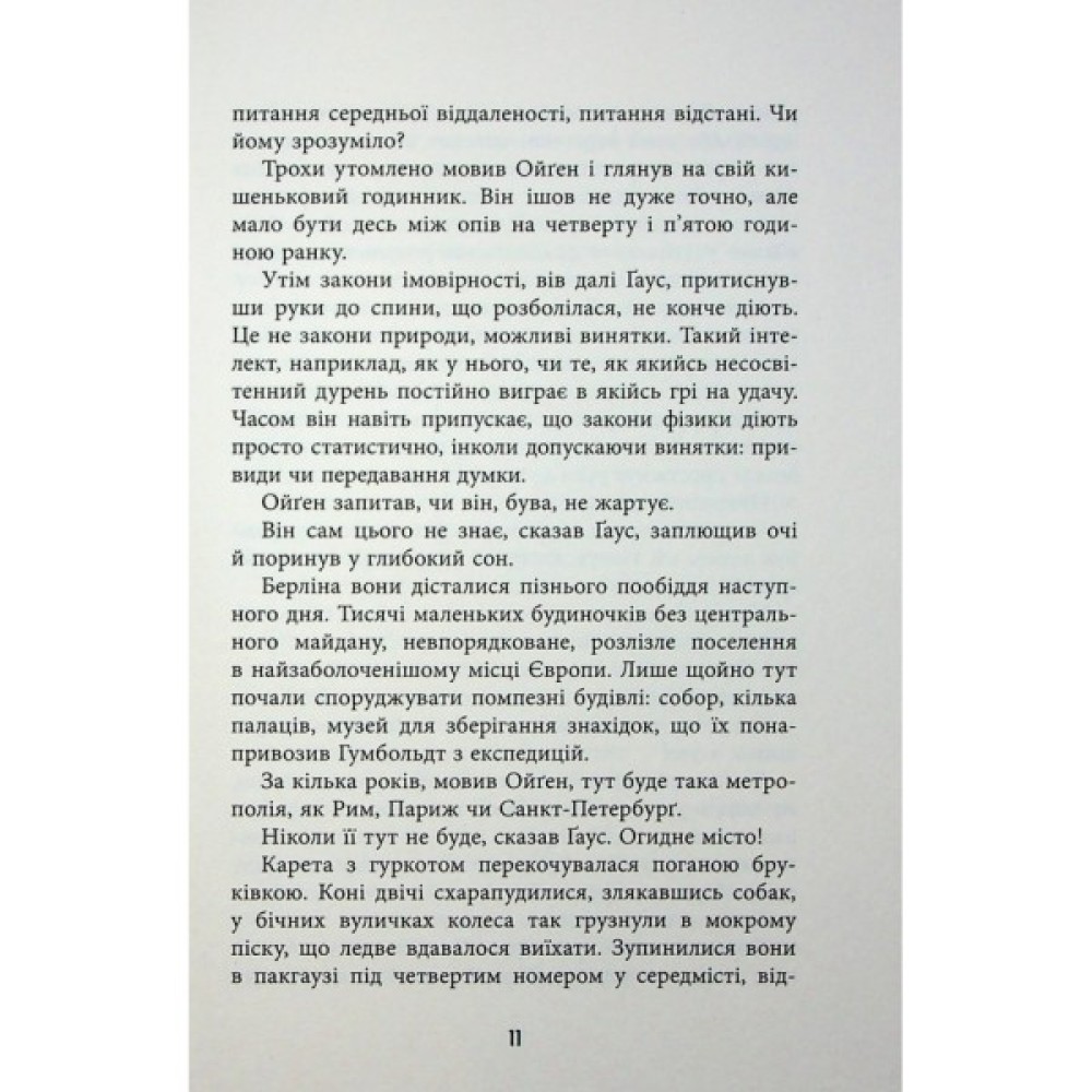 Наприкінці XVIII століття двоє молодих німців абсолютно переконані, що настав час виміряти наш світ. Але ці юнаки — не просто пара молодих людей, які вірять у науку, а двоє майбутніх геніїв епохи Просвітництва. Один із них — прусський аристократ Александер фон Гумбольдт — вирушає у тривалу подорож, перетинає савани і продирається крізь джунглі, спускається річкою Оріноко, пробує отрути, підіймається на найвищу гору та досліджує буквально все, що трапляється на його шляху. Іншому — математику й астроному Карлу Фрідріху Ґаусу — навіть не треба залишати свій будинок у Ґеттінґені, щоби довести, що простір має кривизну. Гумбольдт згодом увійшов до історії як другий Колумб, Ґаус був визнаний найвеличнішим математичним розумом своєї епохи. Ексцентричні і фантастично популярні в Європі, ці двоє 1828 року нарешті зустрічаються в Берліні — і негайно опиняються у вирі політичних потрясінь, що охопили Німеччину після падіння Наполеона.