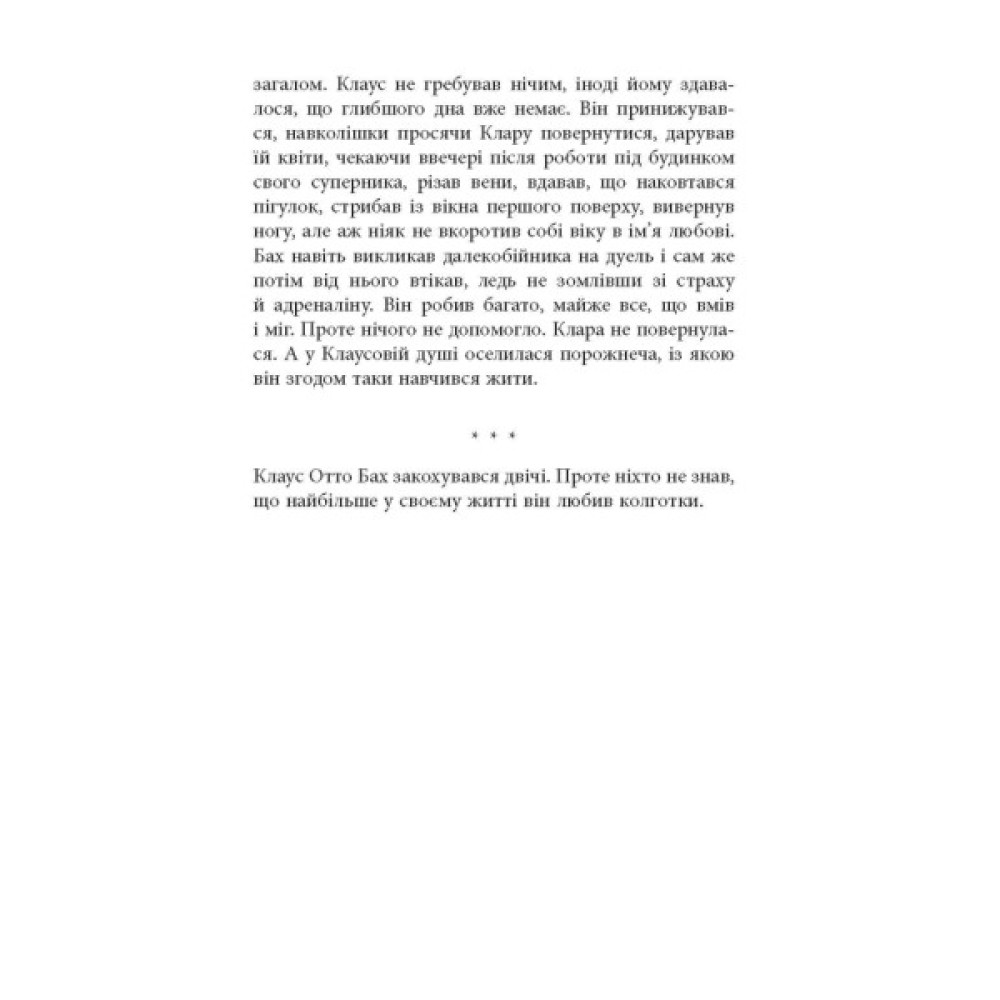 Чим може обернутися інтернет-знайомство з юною та вродливою іноземкою? Звісно ж, коханням усього життя! Принаймні так вважає 43-річний Клаус Отто Бах, мешканець німецького містечка Кіля. Клаус полишає все і прямує до чужого краю з єдиною метою — відшукати жінку своєї мрії, зв'язок із якою випадково обірвався. На його нещастя, цим краєм виявилася велика і незбагненна, щедра та неприборкана Україна. Так, Клауса називатимуть «останнім романтиком». Так, з нього глузуватимуть не лише випадкові знайомі, але й сама доля, підкидаючи все нові пригоди та випробування. Але наш «сучасний Дон Кіхот» не відступить. І врешті доля змилостивиться, подарувавши Клаусові вистраждану та солодку мить щастя, а читачеві найнесподіваніший з усіх можливих фіналів.