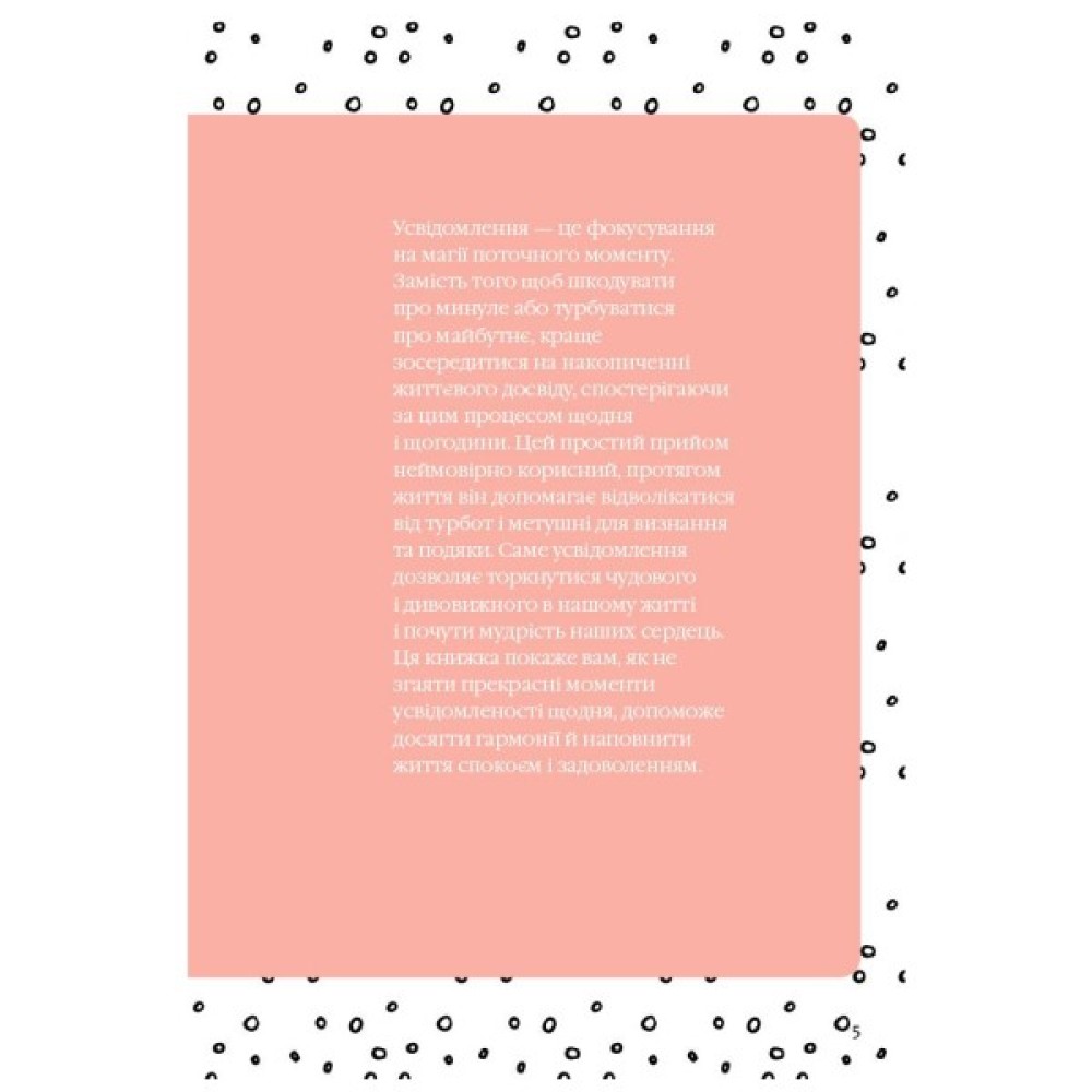 Чи хотіли б ви почуватися менш схильним до стресу, жити спокійніше і більш змістовно? Навчіться цінувати поточний момент і прийміть усе, що підносить вам життя. Запропоновані способи допоможуть вам краще зрозуміти себе й досягти цього й багато іншого. Прості поради, висловлювання, що надихають на самовдосконалення, і кумедні жарти наповнять кожен ваш день вдячністю і спокоєм.