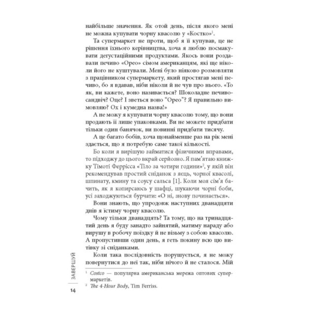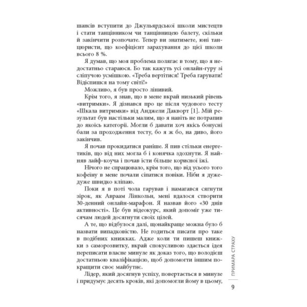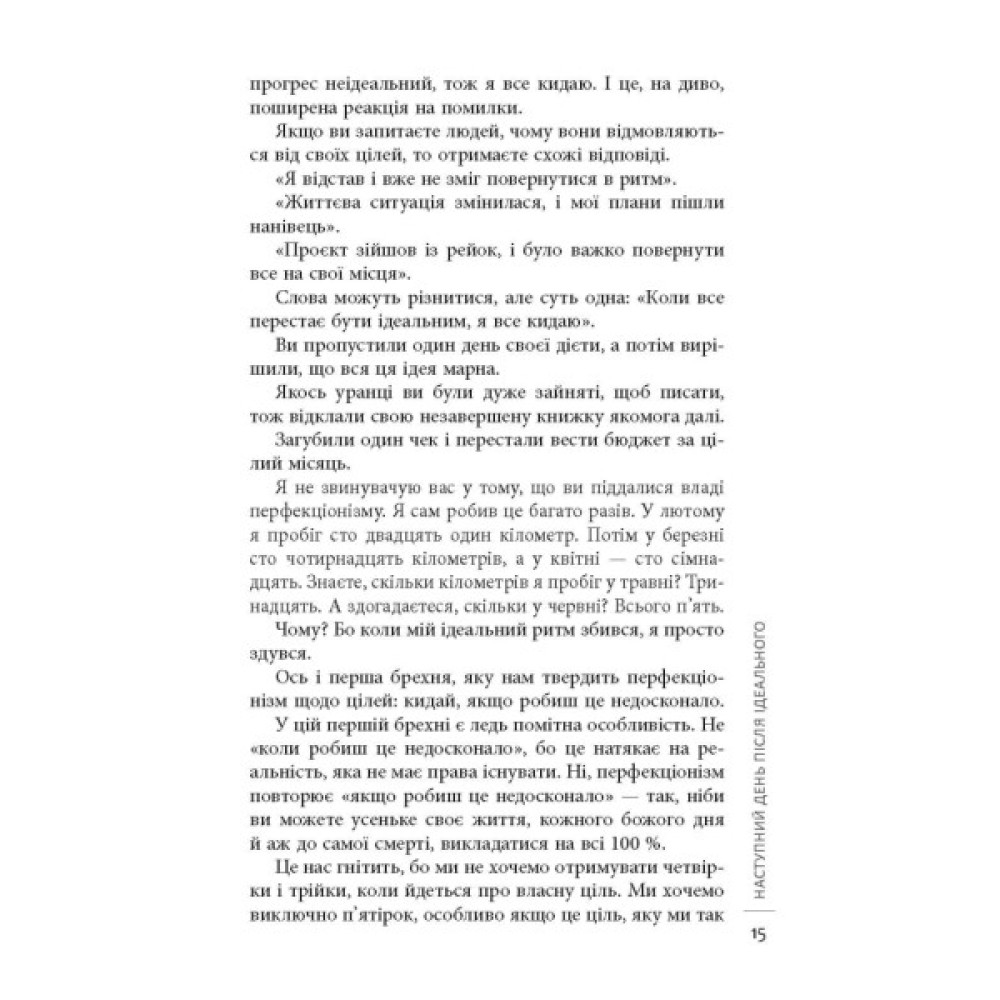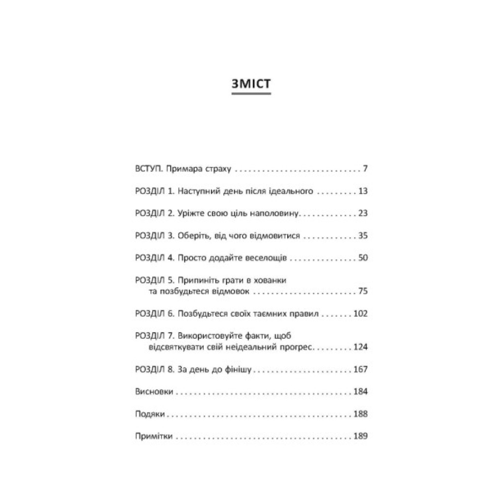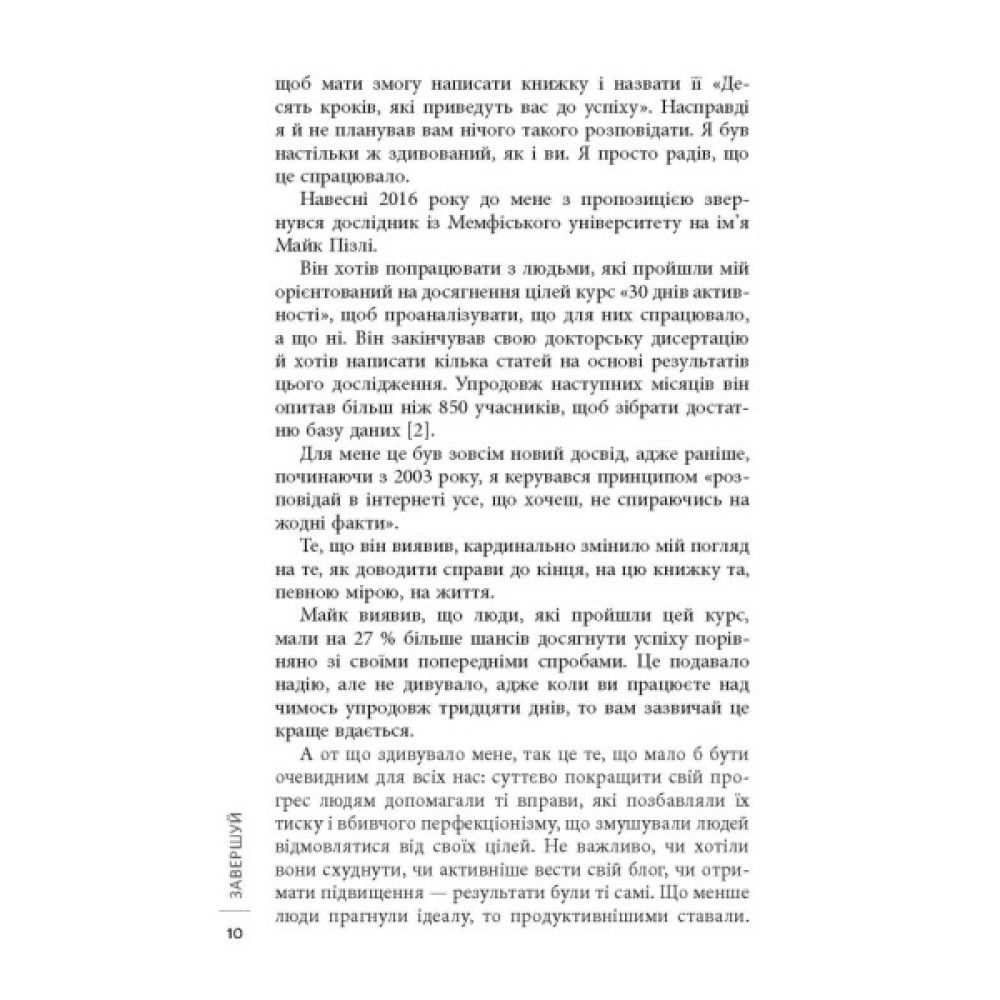 Якщо кожного понеділка ви хочете записатись у спортзал, якщо в шафі кілька місяців лежить недоплетений светр, якщо вже кілька років збираєтесь зробити перестановку в кімнаті, то ця книжка для вас. Джон Ейкафф розповідає, як правильно сформувати й оцінити мету, надати їй вимірюваного вигляду для кращого відслідковування результатів. Він говорить про перешкоди, які траплятимуться на шляху, і ділиться секретами їх подолання. Спираючись на власний досвід й історії інших людей, автор виводить універсальні правила, які допоможуть не кинути розпочате ні наступного дня, ні на півдорозі, ні вже перед самим фінішом. Завдяки простим, але дієвим порадам Ейкаффа ви будете досягати своїх цілей і доводити справи до кінця.