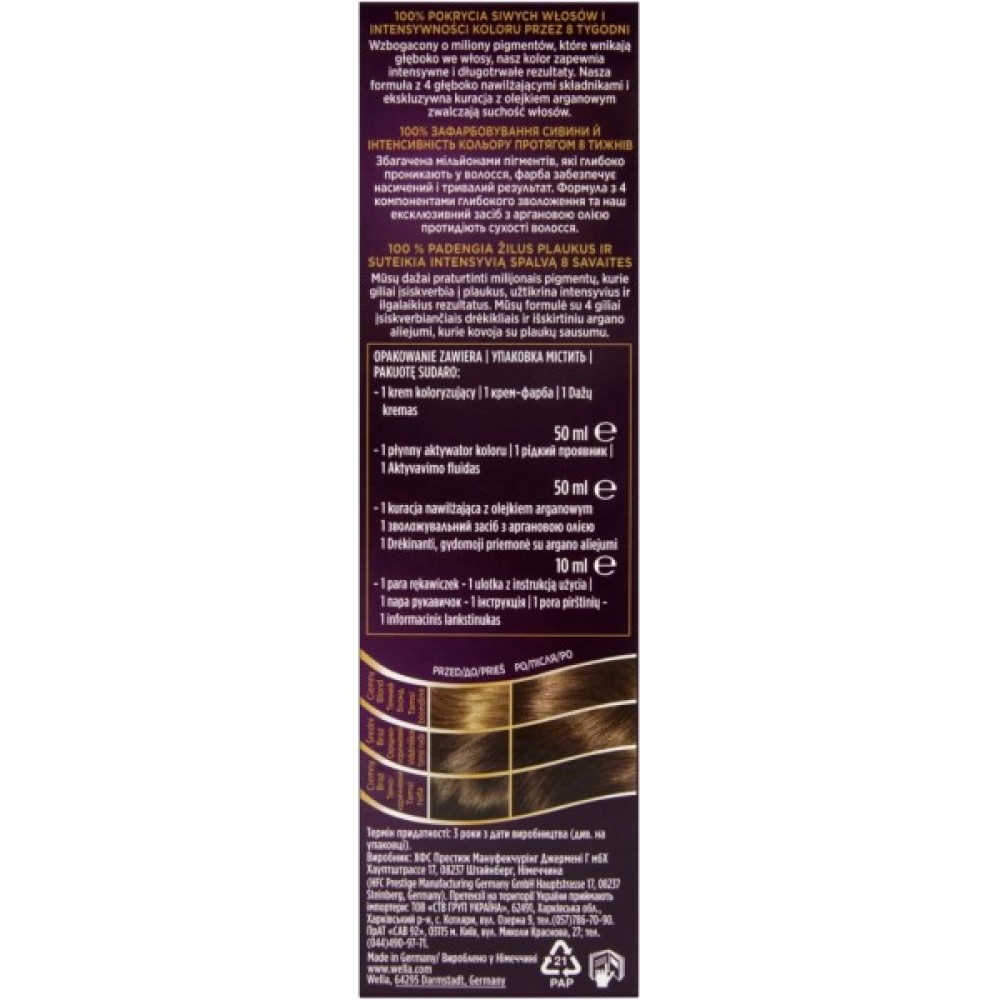 Цю фарбу розроблено для всіх типів волосся, гарантуючи рівномірне покриття від коренів до кінчиків. У комплекті ви знайдете ексклюзивну сироватку, яка відновлює яскравість між фарбуваннями, додаючи додатковий шар пігменту. Окрім того, товар вироблено в Німеччині, що підтверджує високу якість і надійність продукції.