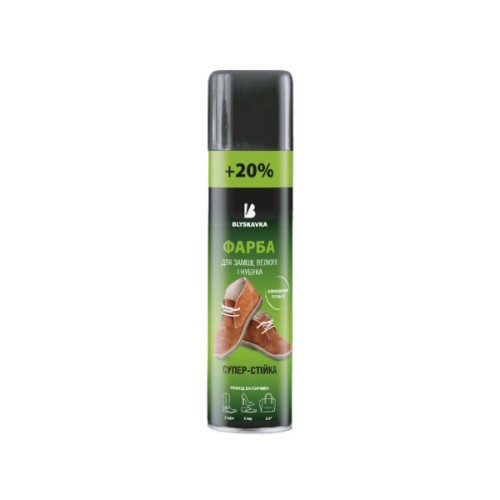 Фарба BLYSKAVKA відновлює колір, зберігаючи оксамитову структуру взуття, одягу й аксесуарів із замші, забезпечуючи доглянутий вигляд і захист виробів упродовж усього дня.