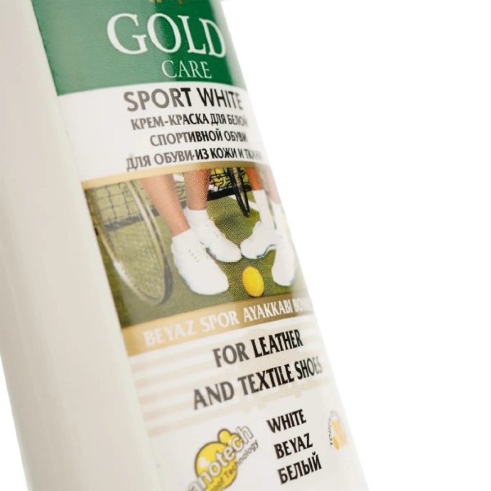 Gold Care Крем-фарба для білого спортивного взуття з шкіри та текстилю - засіб для відновлення кольору і вигляду взуття. Приховує потертості і подряпини, надаючи йому свіжий вигляд. Легко наноситься на шкіру та текстиль, швидко висихає і не залишає слідів. Ідеальний для того, щоб тривалий час зберігати взуття у відмінному стані.
