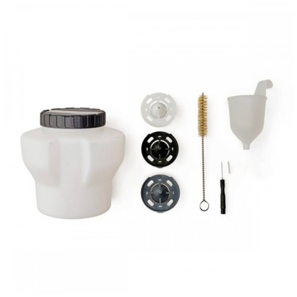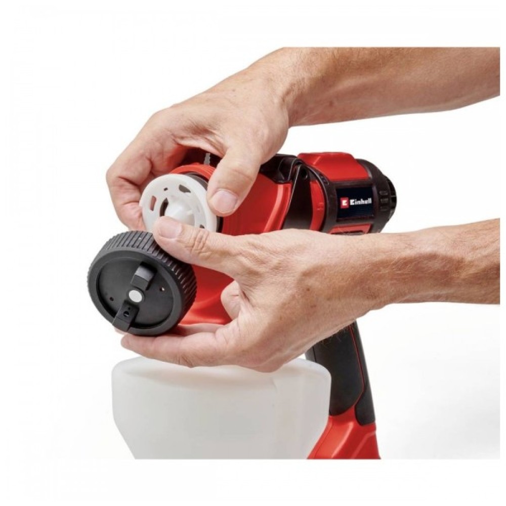 Акумуляторний фарборозпилювач Einhell постачається з практичними аксесуарами. У комплект поставки входять 3 сопла (3,0 мм, 2,5 мм, 1,5 мм) для різної в'язкості фарби, глазурі та кольору, контейнер для фарби (1200 мл) з мірною шкалою і кришкою, а також контейнер для тестування в'язкості. Для оптимального очищення фарборозпилювача до комплекту поставки також входять щітка для чищення та голка для чищення.