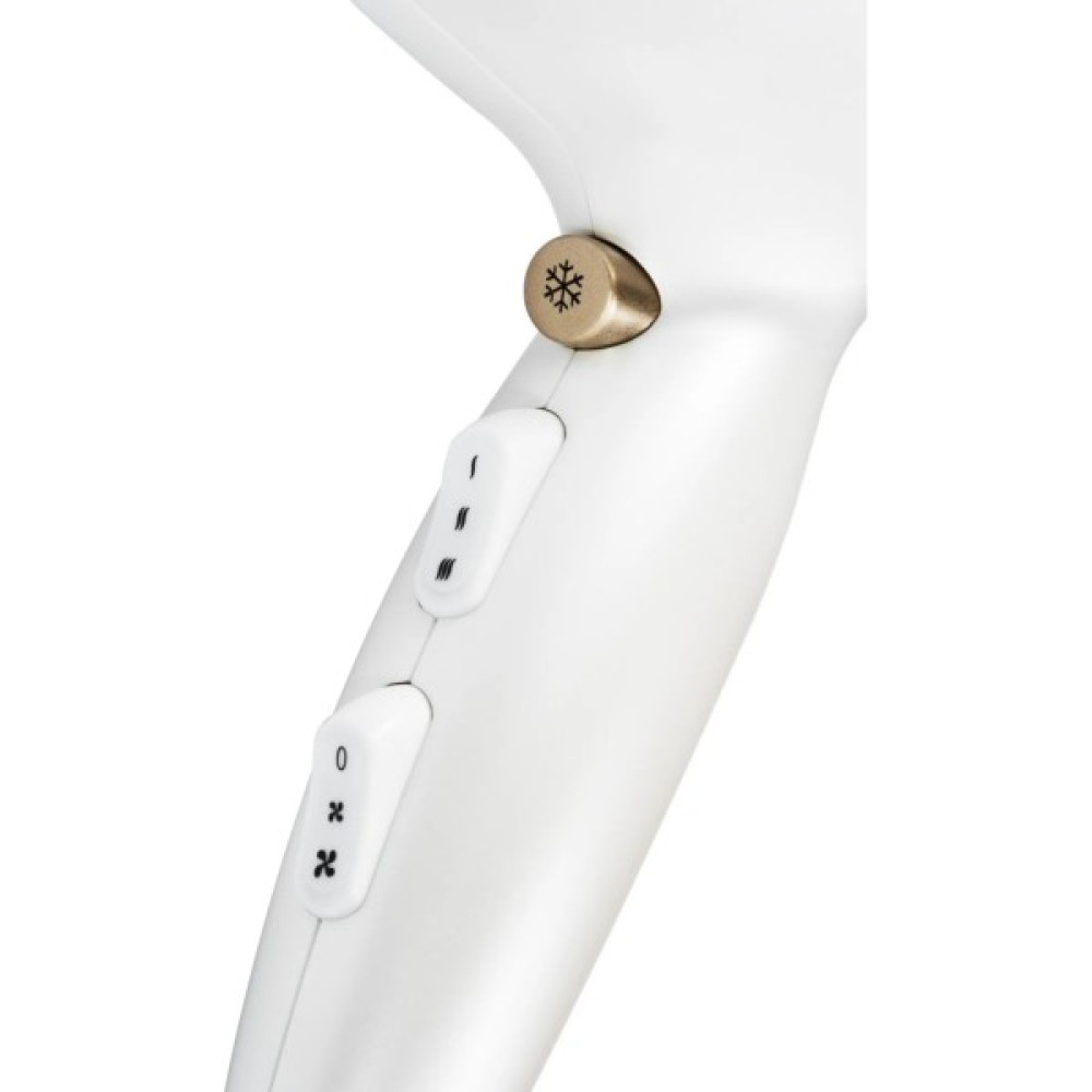 Особливої уваги заслуговує петля для підвішування, за допомогою якої фен легко зберігати, заощаджуючи місце у ванній кімнаті. Його стильний білий колір додає сучасності та елегантності, гарантуючи, що пристрій гармонійно впишеться в будь-який інтер'єр.