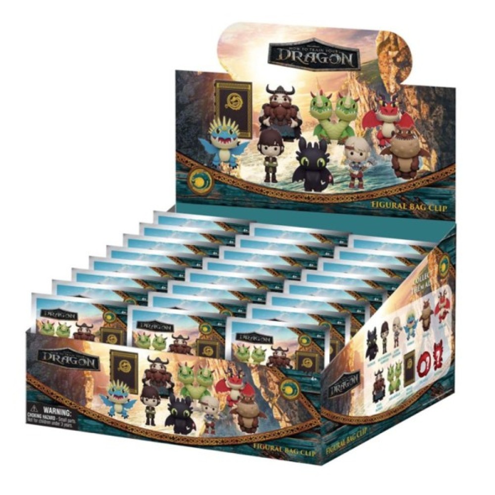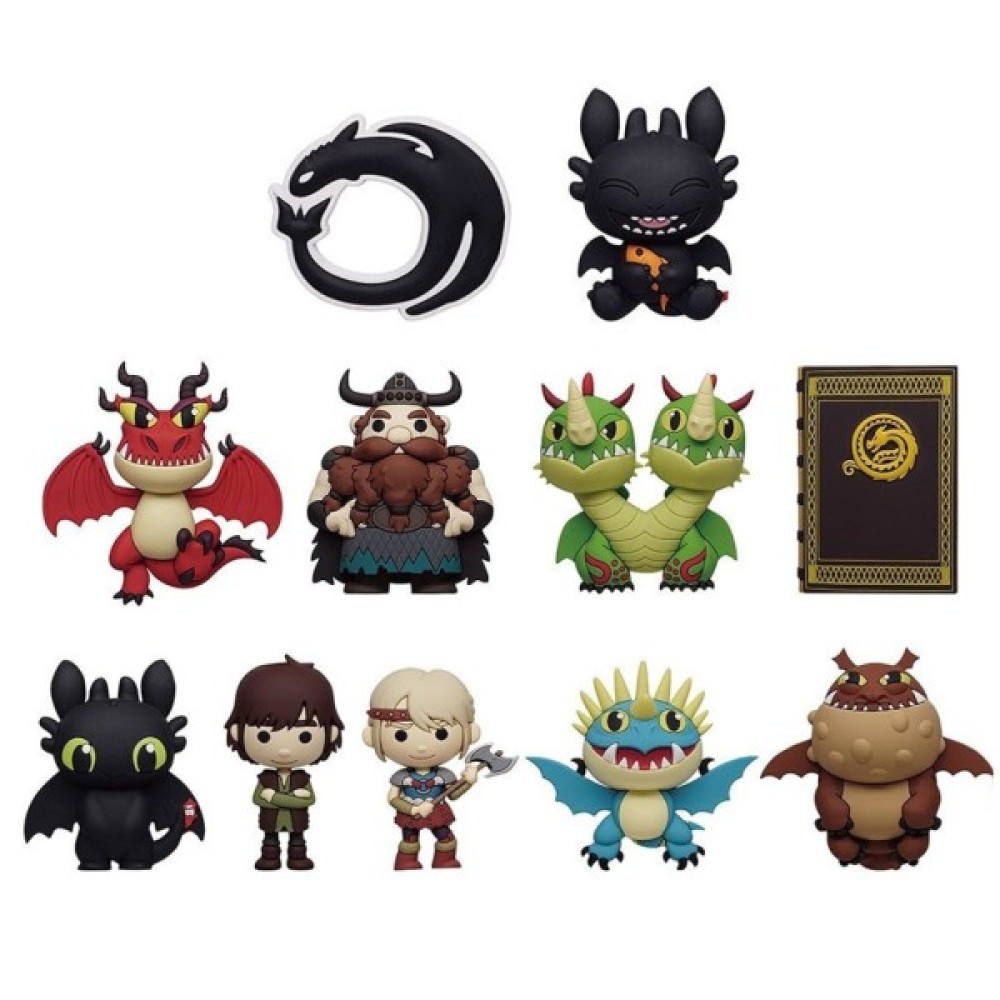 - В асортименті 11 головних героїв з яких 2 рідкісних: Беззубик, Гикавка, Астрід, Буревійка, Сарделька, Іклогак, Стоїк, Блювко та Відриг, Книга драконів, Логотип з драконом (рідкісний) і Милий Беззубик (рідкісна).