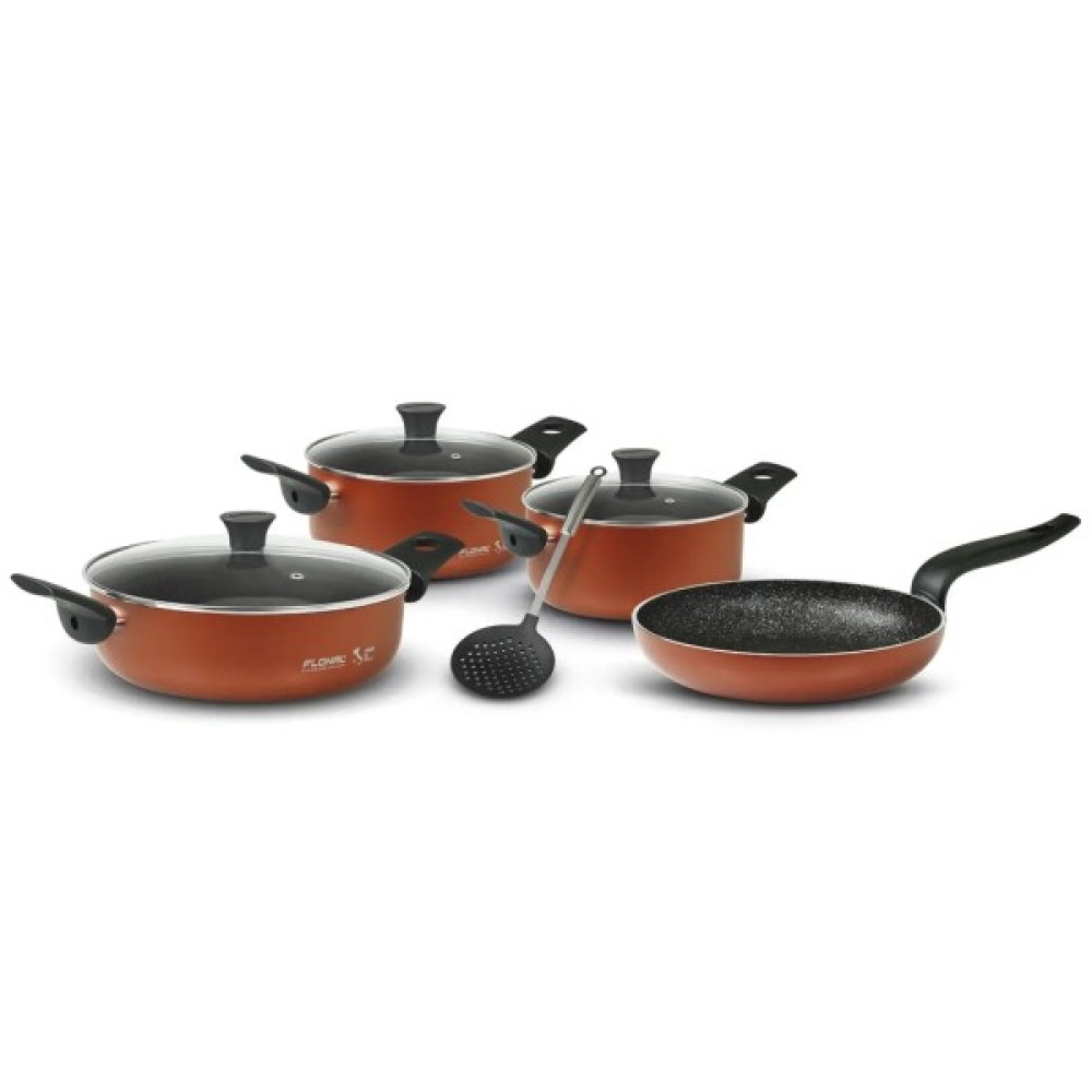 Набір посуду для приготування їжі Flonal Pepita Granit складається з 8 предметів, а саме зі сковорідки, двох каструль, сотейника, трьох кришок для них, а також в подарунок додана зручна шумівка для зняття піни та виймання продуктів в процесі приготування.