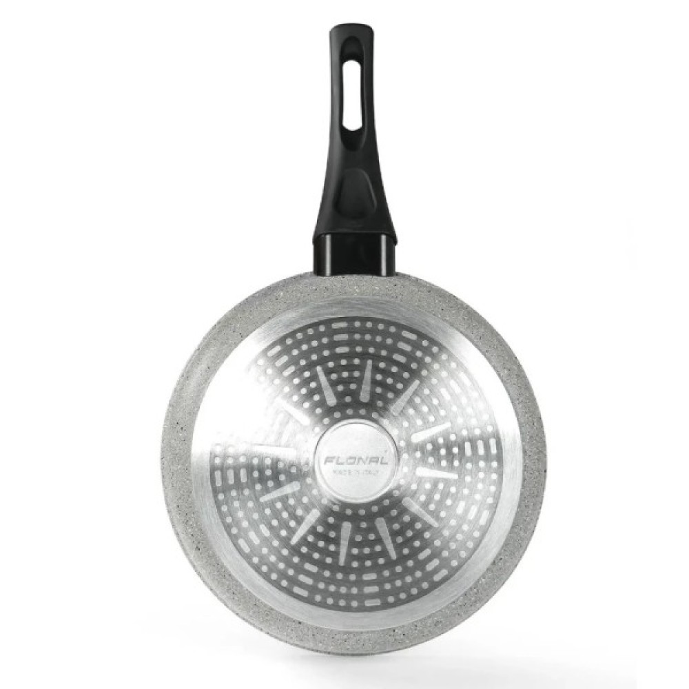 Більше місця для приготування всередині - це те що відрізняє алюмінієву сковороду Flonal Dura Induction від багатьох інших сковорідок. Неймовірно широке дно при стандартних зовнішніх розмірах забезпечує рівномірне приготування більшої кількості їжі. Сковорода має ультраміцне багатошарове мінеральне антипригарне покриття Magma-Tech Plus, що на 35% стійкіше за інші покриття виробника, та лишається стійким навіть при використанні металевих кухонних аксесуарів, і робить можливим приготування їжі без додавання олії. Потовщені стінки і багатошарове дно дозволяють готувати широкий спектр щоденних страв, та роблять цю сковороду придатною для тушкування.