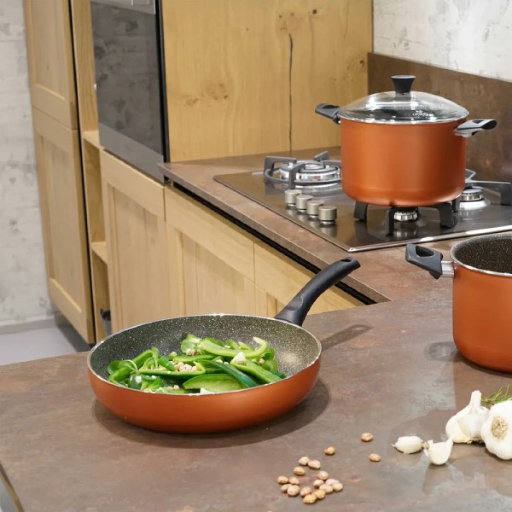 Елегантна форма ручки ще й досить зручна для захвату, та дозволяє їй менше нагріватись в зоні контакту з долонею. Логотип виробника з контурами Італії та написом "Made in Italy", нанесений на корпус сковороди шовкотрафаретним методом, також надає оригінальний відтінок елегантності. Нижня частина сковорідки має рифлене антиковзке покриття, що робить приготування більш безпечним.