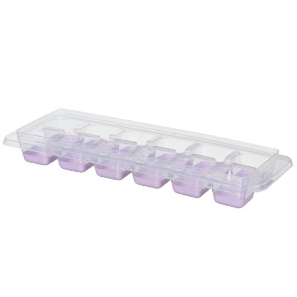 Пластикова прозора форма для льоду на дванадцять кубиків з силіконовим дном та гнучкою кришкою з клапаном.
