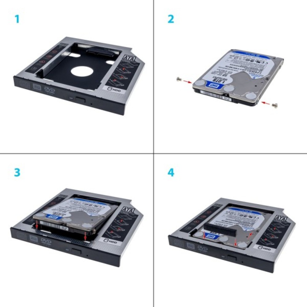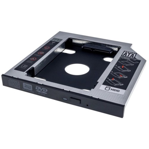 Адаптер призначений для під'єднання другого жорсткого диска (наприклад SSD) у ноутбук замість приводу CD/DVD/Blu-ray завтовшки 12.7 мм. Пристрій Plug&Play — підключив і працює. Повністю інтегрований у ноутбук, кабелі / блоки живлення / програмне забезпечення / драйвери не потрібні.
