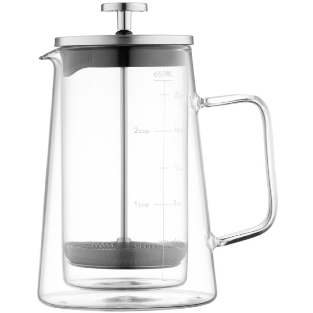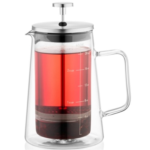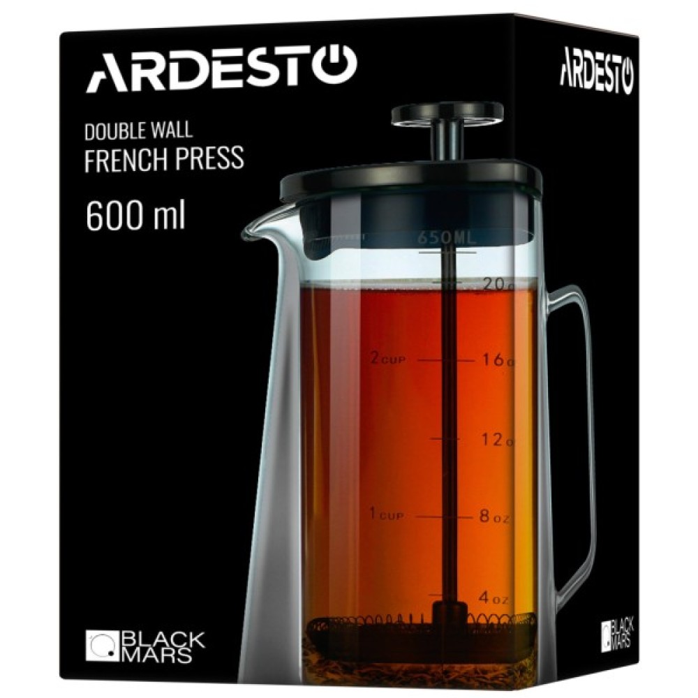 Для заварювання смачних кавових напоїв або ароматного чаю в пригоді стане френч-прес ARDESTO серії Black Mars. Модель із кришкою з нержавіючої сталі виготовлено з екологічного боросилікатного скла, яке вирізняється міцністю і стійкістю до перепадів температури, гарантуючи тривале слугування та безпечне використання. Виріб має подвійні стінки, а завдяки повітряному прошарку між ними довше зберігається потрібна температура напою, зовнішня стінка не нагрівається. Об’єм френч-преса – 650 мл, а термостійкість – від -20 до +150 °C. Не рекомендовано миття в посудомийній машині.