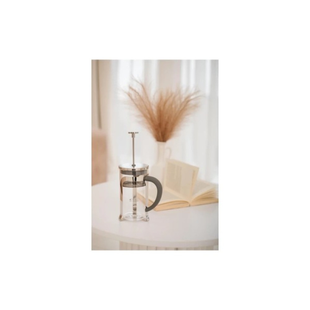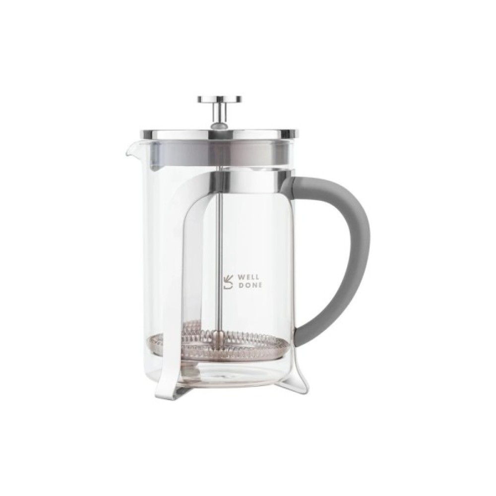 Френч-прес Well Done виготовлений термостійкого скла та багато в чому дає фору звичайним заварникам. Крім класичного використання - приготування чаю та кави - в ньому зручно збивати вершки, готувати холодну каву або сік з ягід. Плунжер із сітчастим фільтром щільно прилягає до стінок та ретельно фільтрує напій.