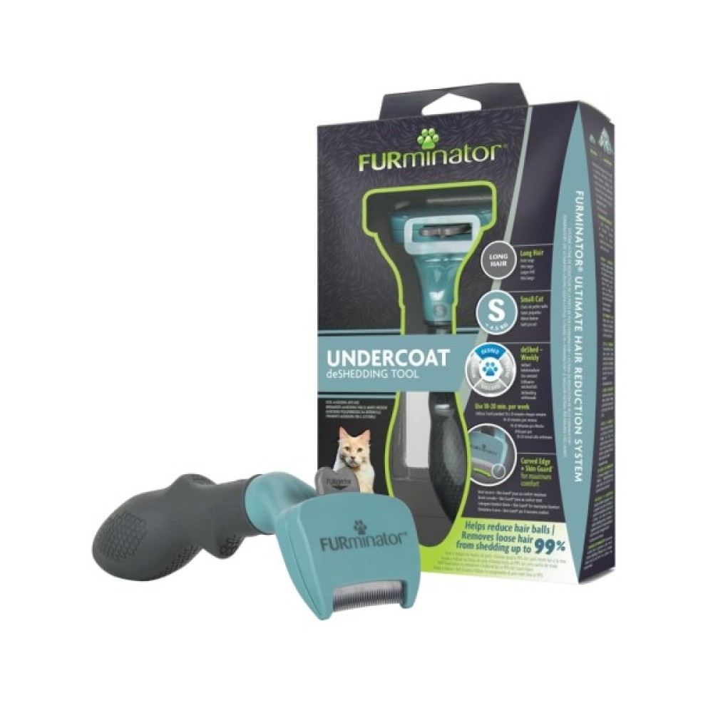 FURminator спеціально розроблений для маленьких котів вагою до 4,5 кг із шерстю понад 5 см. Ослаблена шерсть легко видаляється під час розчісування, а підшерстя стоншується, зменшуючи випадіння до 99%. Водночас закруглене лезо рівномірно розподіляє природний жир шкіри вашого вихованця й зберігає шерсть здоровою й блискучою. Тому власники тварин вважають інструменти проти линяння FURminator золотим стандартом із контролю над шерстю тварини — навіть неспокійним і нервовим котам потрібна мінімальна кількість часу, щоб звикнути до цього унікального інструмента.