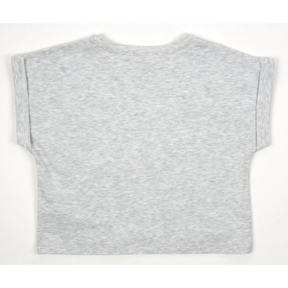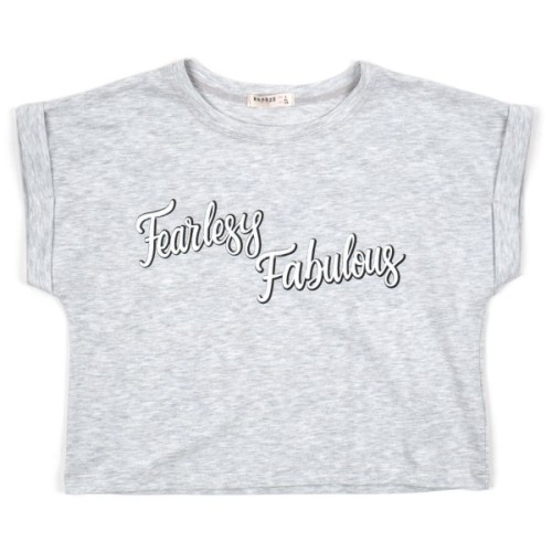 • Коротка лаконічна футболка сірого меланжевого кольору, прикрашена на грудях ефектним принтовим написом «Fearless Fabuloys» з глітерним напиленням.