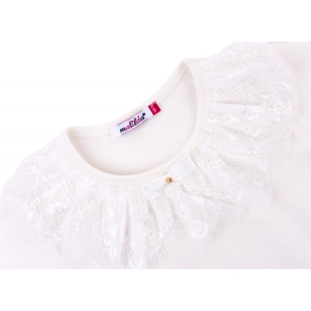 Пропонована модель дуже приємна на дотик, спереду прикрашена ошатними мереживними рюшами в тон футболки і милим атласним бантиком по центру горловини. Еластична кругла горловина, оформлена ніжною трикотажною бейкою, і м'який трикотаж полегшать процес одягання. Додатковою прикрасою моделі служить обробка низу і рукавів футболки м'якою, з сітчастого матеріалу, бейкою.