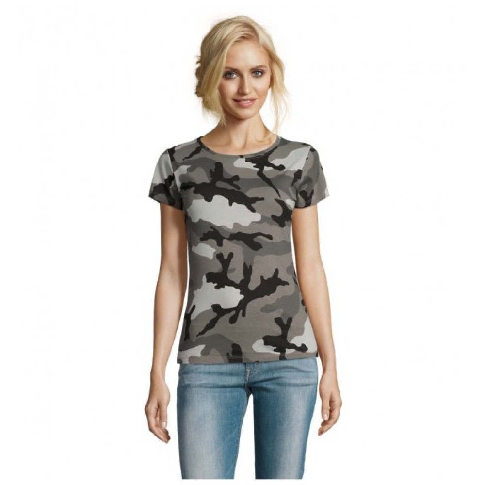 Жіноча камуфляжна футболка Camo Women з круглою горловиною. Виріз оброблений рібом з додаванням еластану 1x1, зміцнююча тасьма по коміру. Закруглені рукава. Подвійні шви для запобігання деформації виробу. Облягаюча модель. М’який на дотик матеріал, чіткий друк, підходить для друку та вишивки.