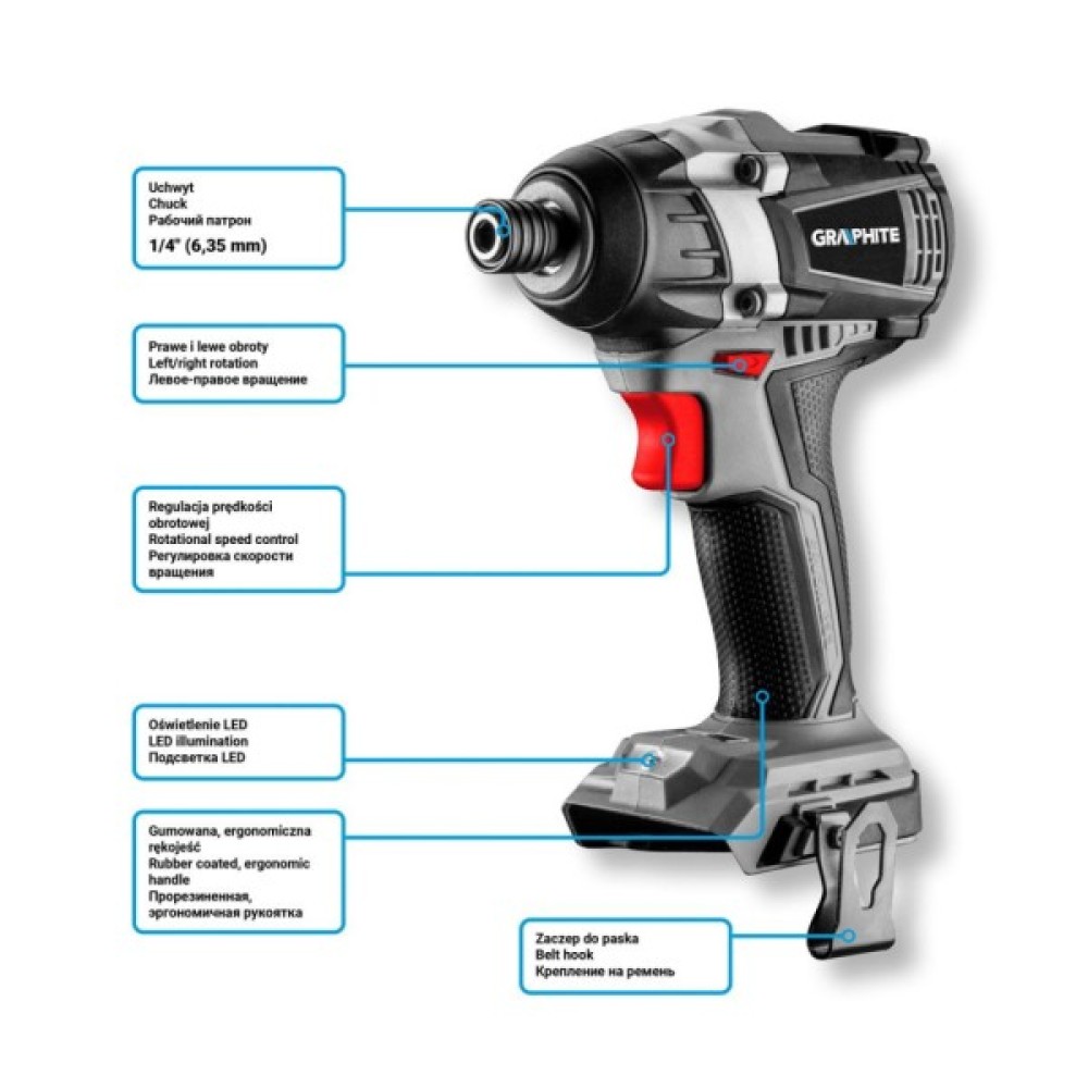 Цей акумуляторний ударний гайковерт від Graphite призначений для швидкого загвинчування та відгвинчування гвинтів і болтів у деревині, металі та пластику.