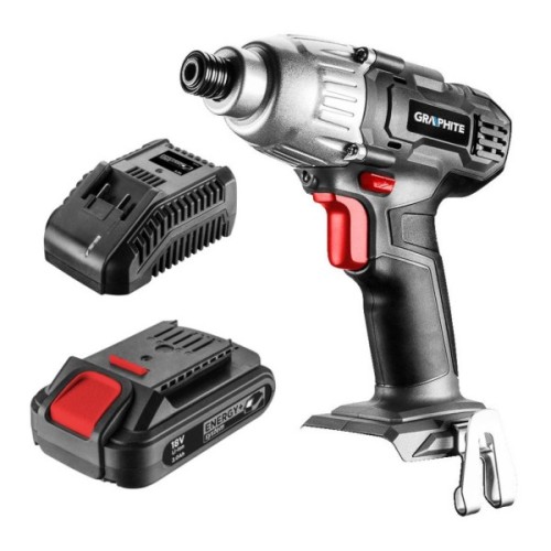 Гайковерт GRAPHITE, що працює з акумуляторними батареями 18 В Li-Ion GRAPHITE Energy +. Електроінструмент призначений для відгвинчування і закручування шурупів і гвинтів в деревину, метал і пластмасу. Дозволяє працювати з великою частотою обертання (до 2200 об. / Хв.), А також забезпечує високий крутний момент (180 Нм).