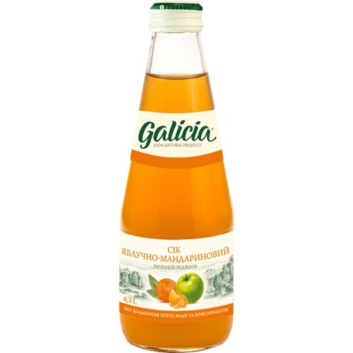 Неосвітлений пастеризований яблучно-мандариновий сік Galicia. Такий популярний і освіжний напій покращує травлення, сприяє опірності організму захворюванням і додає життєвої енергії.