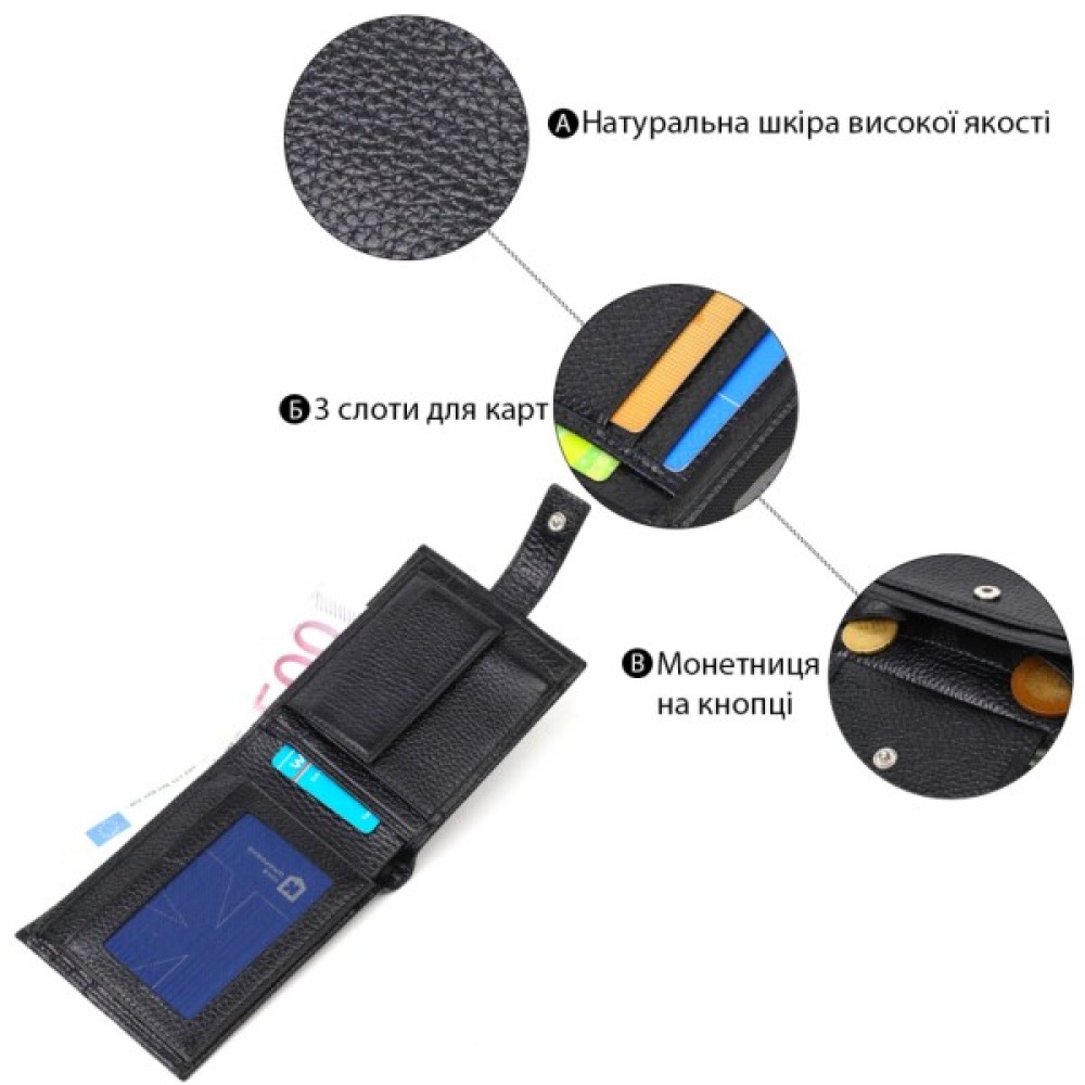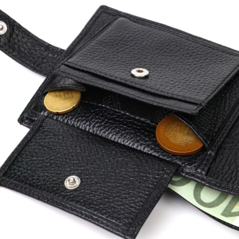 Гаманець закривається навпіл шкіряним хлястиком на кнопку, що забезпечує зручність і безпеку.