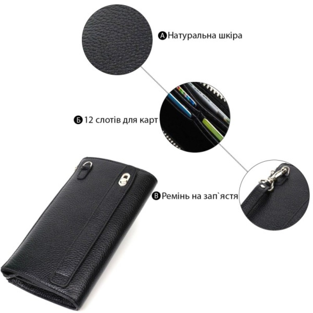 Клатч має два відділення для купюр, дві прилеглі кишені, дванадцять слотів для карток і монетницю на блискавці.