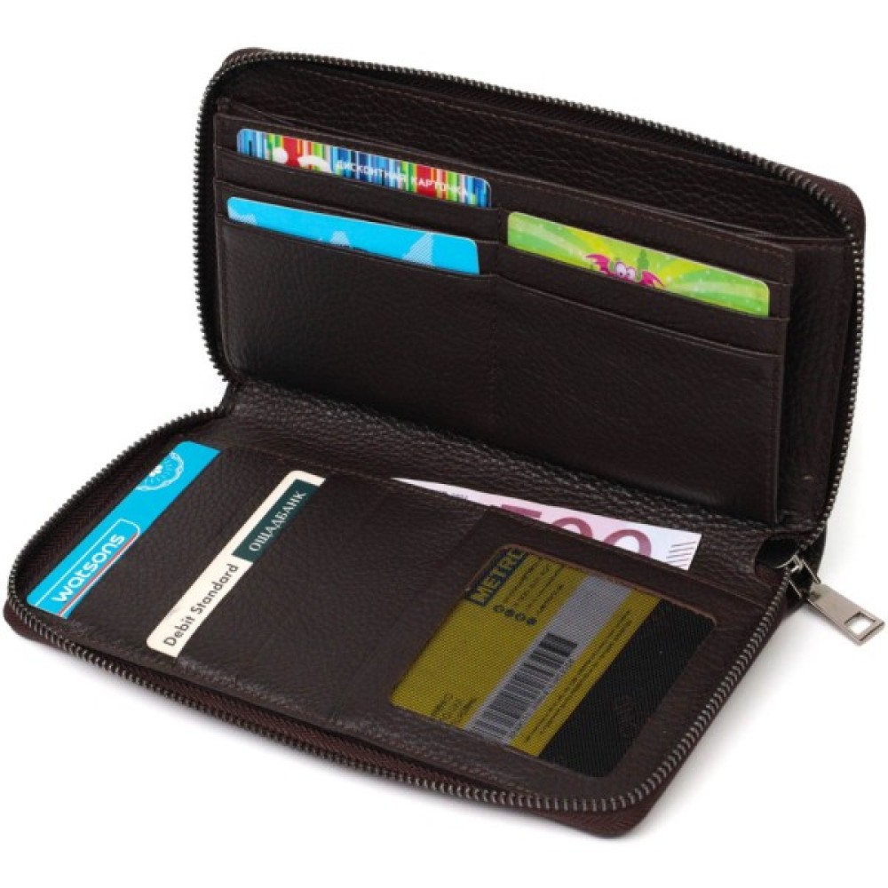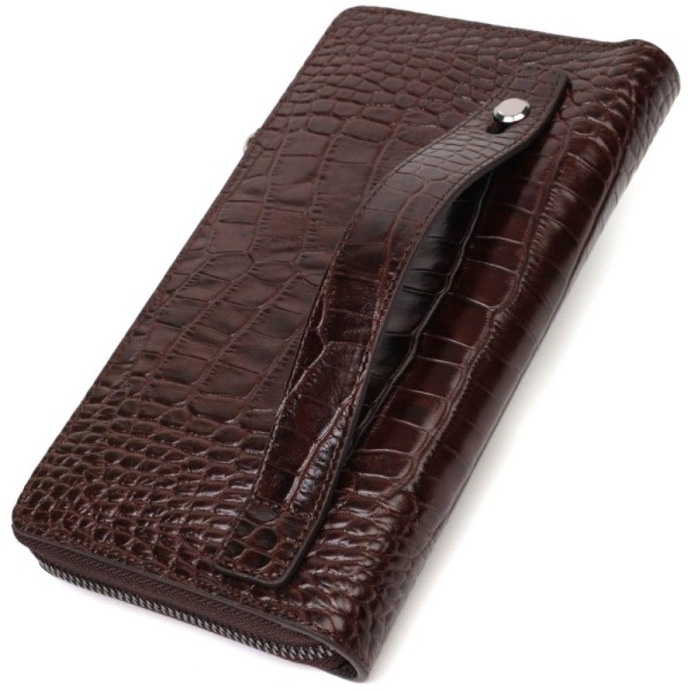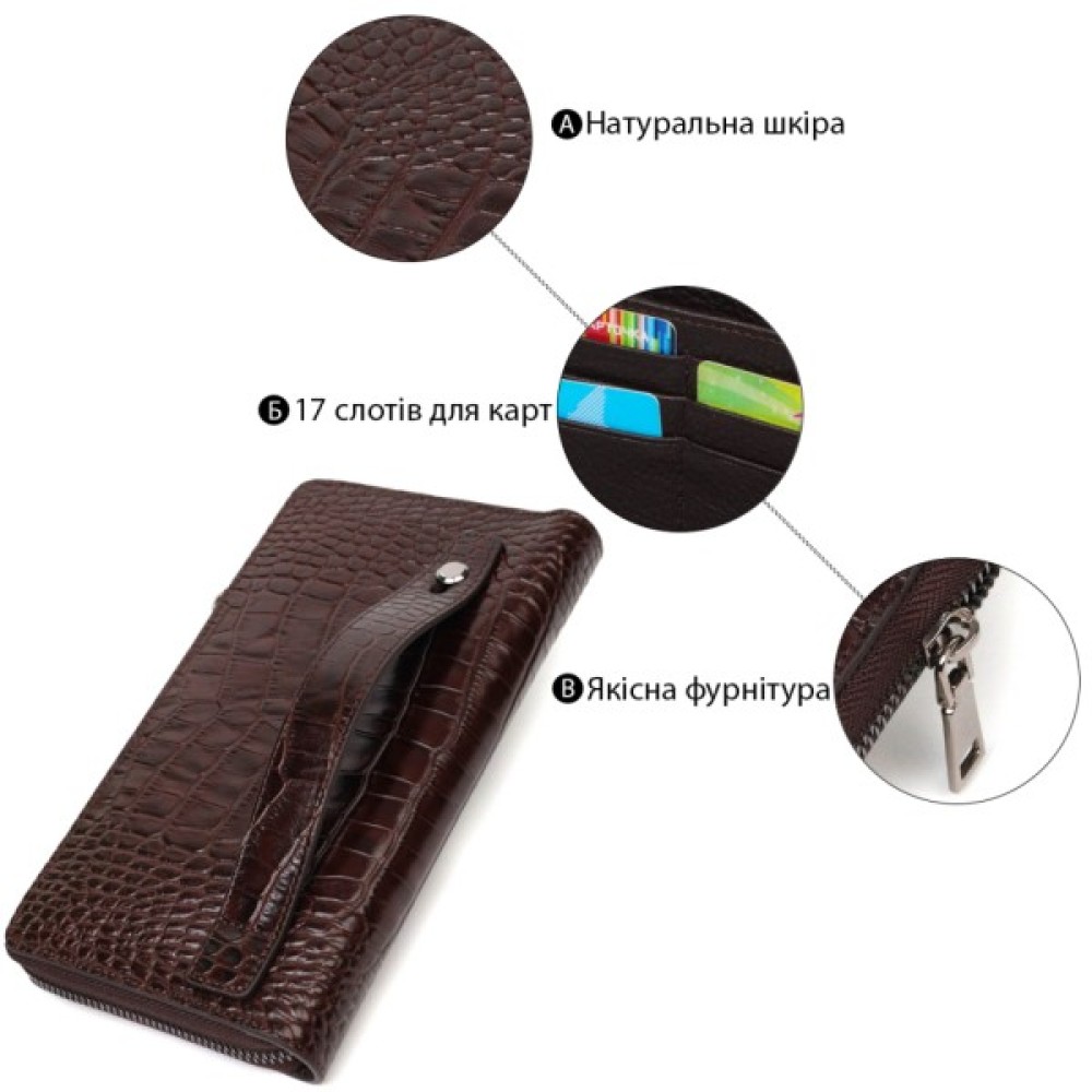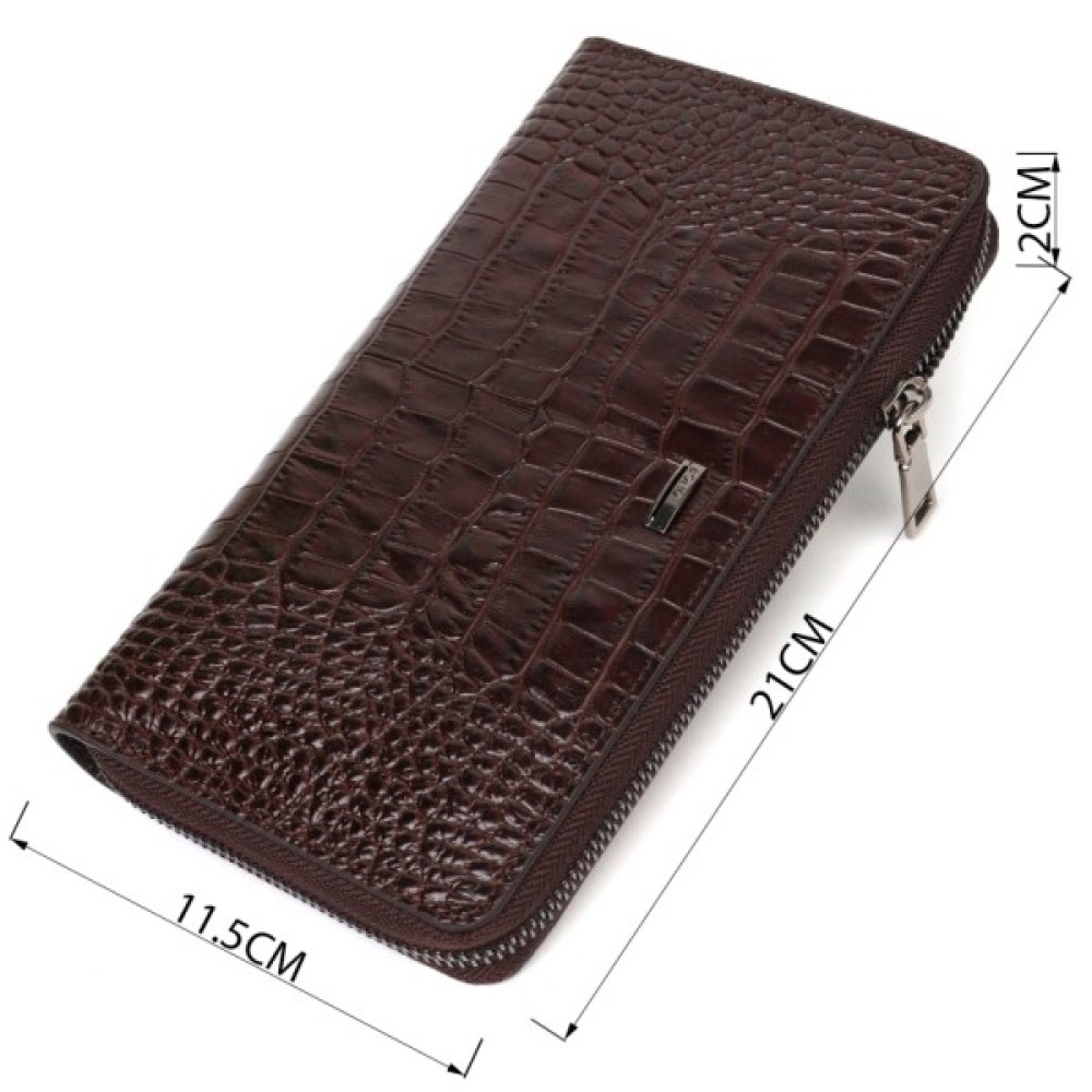 Широкий чоловічий клатч із натуральної шкіри з тисненням під крокодила, гаманець закривається на блискавку, всередині можна без проблем розміщувати паперові банкноти, банківські картки та навіть смартфон. Аксесуар складається з двох відділень для купюр, двох прилеглих кишень, сімнадцяти слотів для кредиток та монетниці на блискавці. Є також ручка для долоні на тильній стороні клатчу.