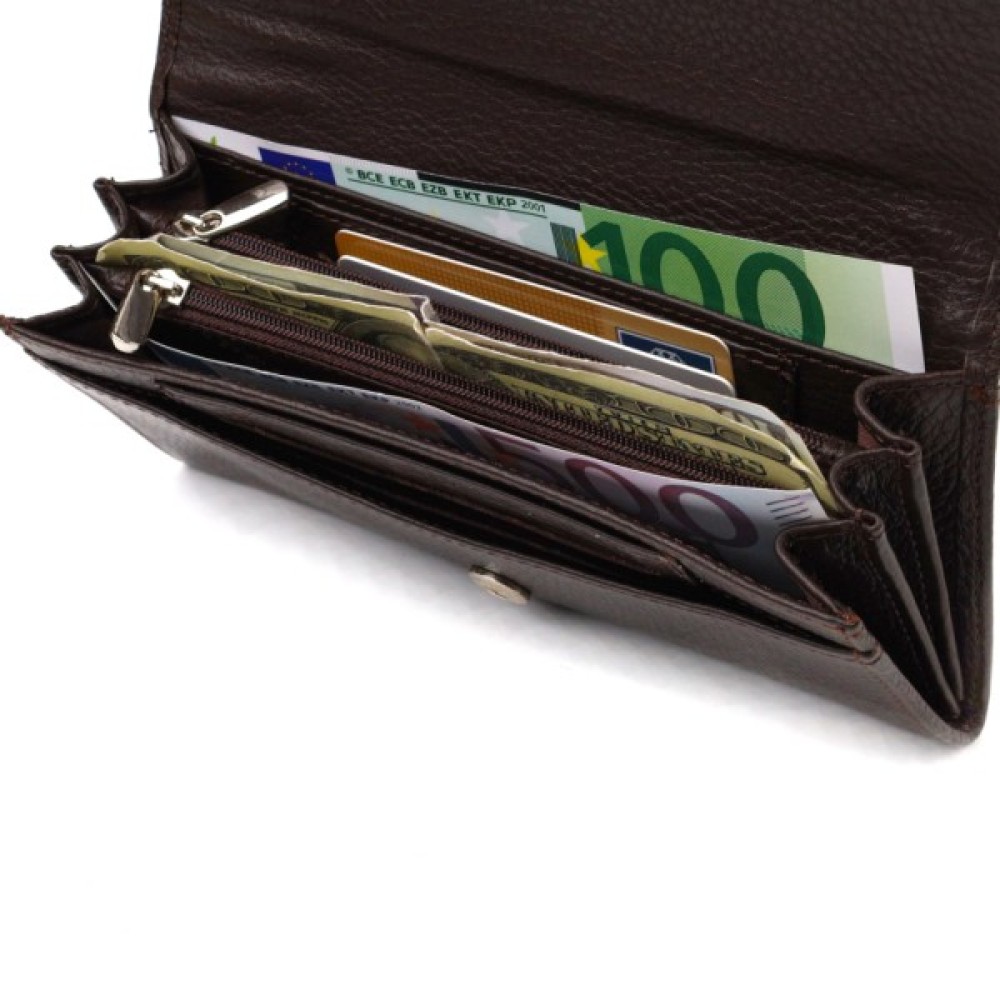 Аксесуар має три основні відділення, у які поміщаються купюри всіх номіналів, дві перегородки на блискавках, чотири кишені для карток, дві прилеглі кишені, глибоку кишеню на всю довжину та монетницю.