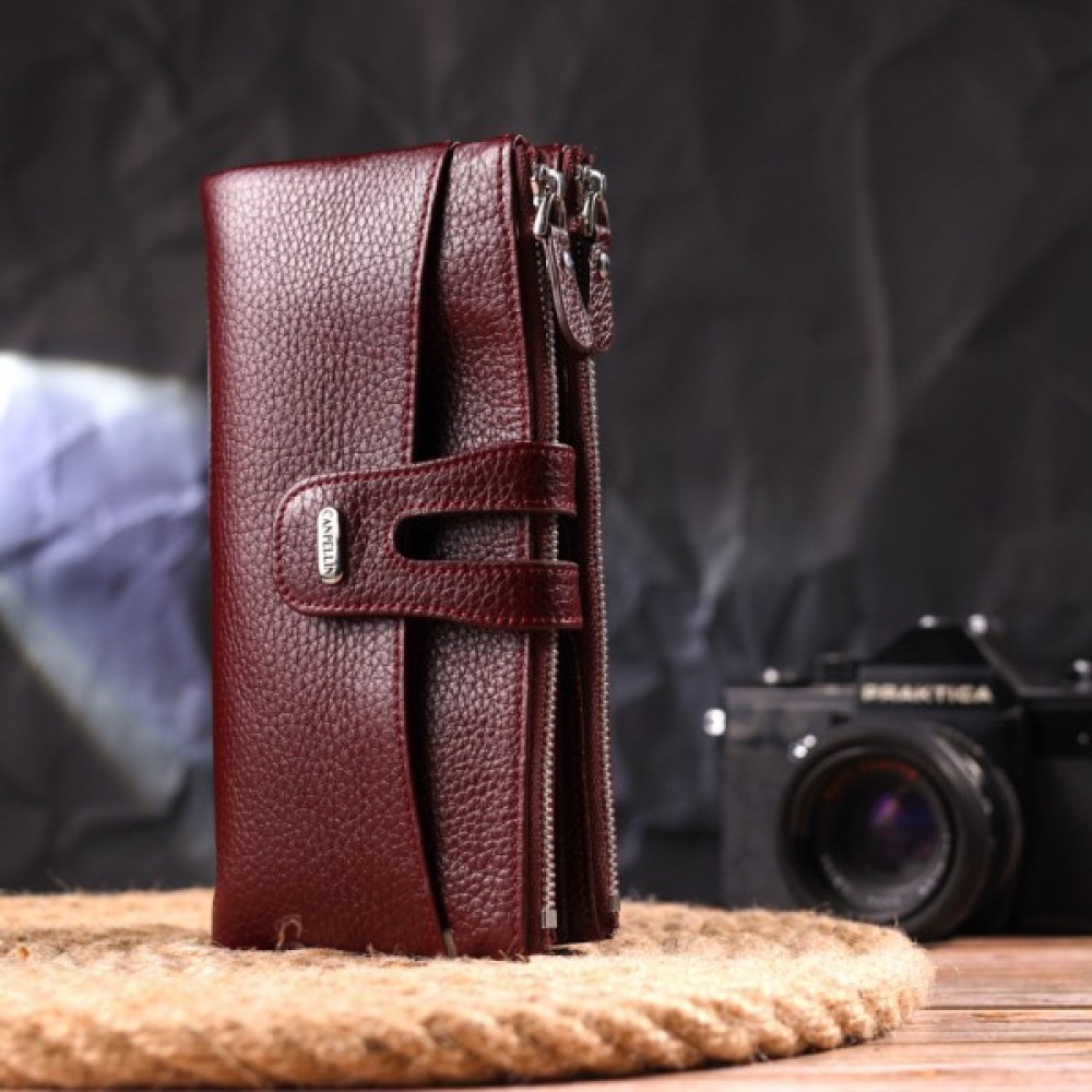Модний жіночий гаманець із натуральної зернистої шкіри. Аксесуар має два широкі основні відділення, в які поміщаються купюри всіх номіналів, дві монетниці, двадцять чотири кишені для карток, дві відкриті зовнішні кишені та одне прозоре віконце для документів. Закривається аксесуар хлястиком на кнопку.