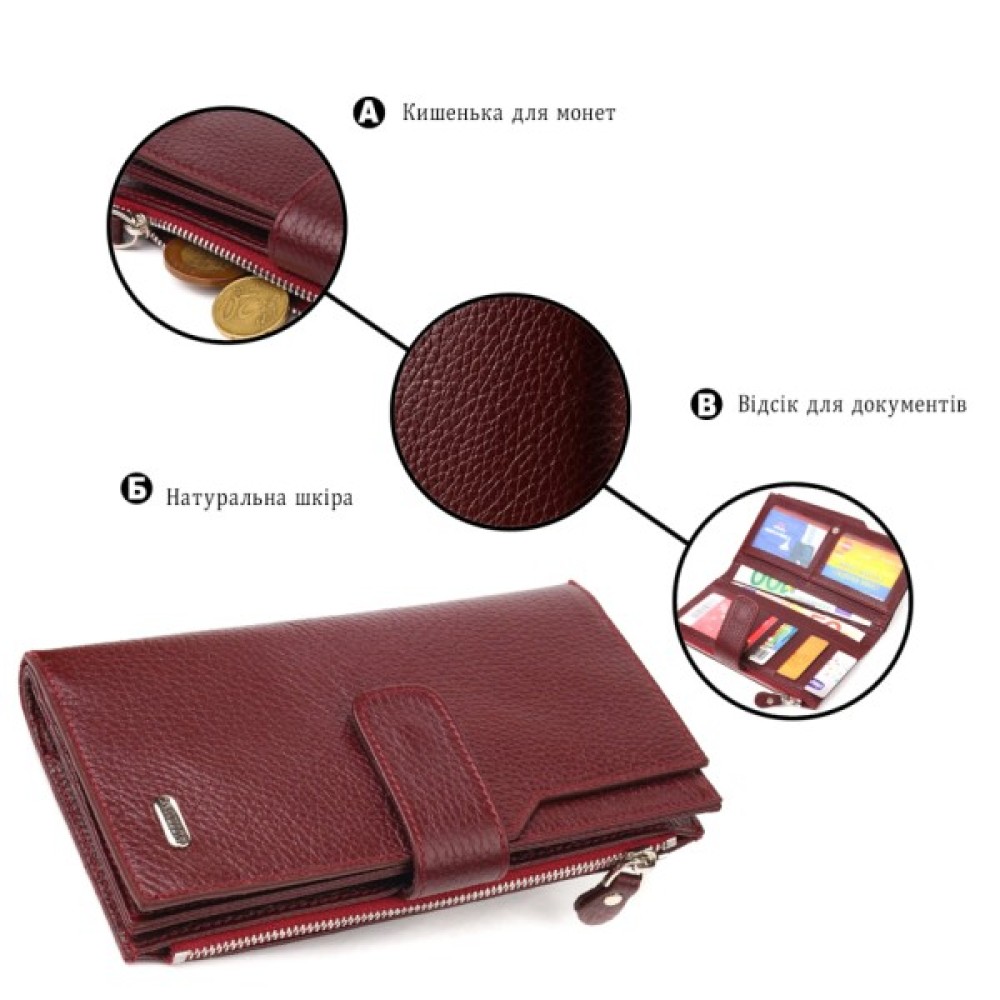 прозоре ID-віконце; подвійне складання; закривається на хлястик з кнопкою; прилеглі кишені; з монетницею; для карт