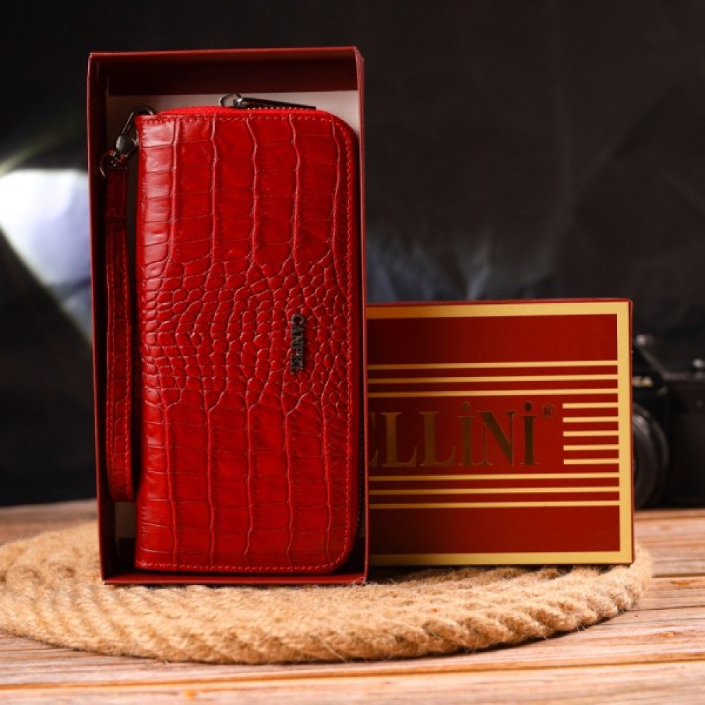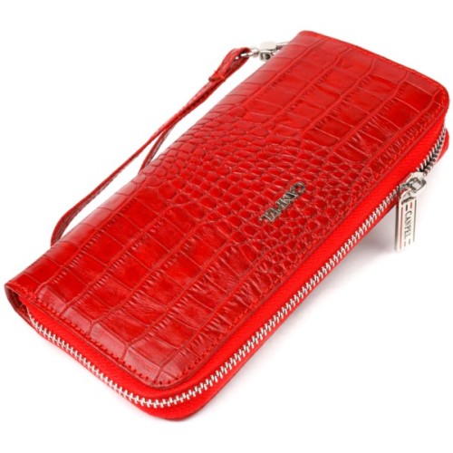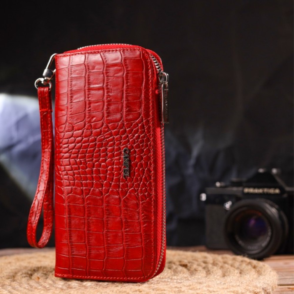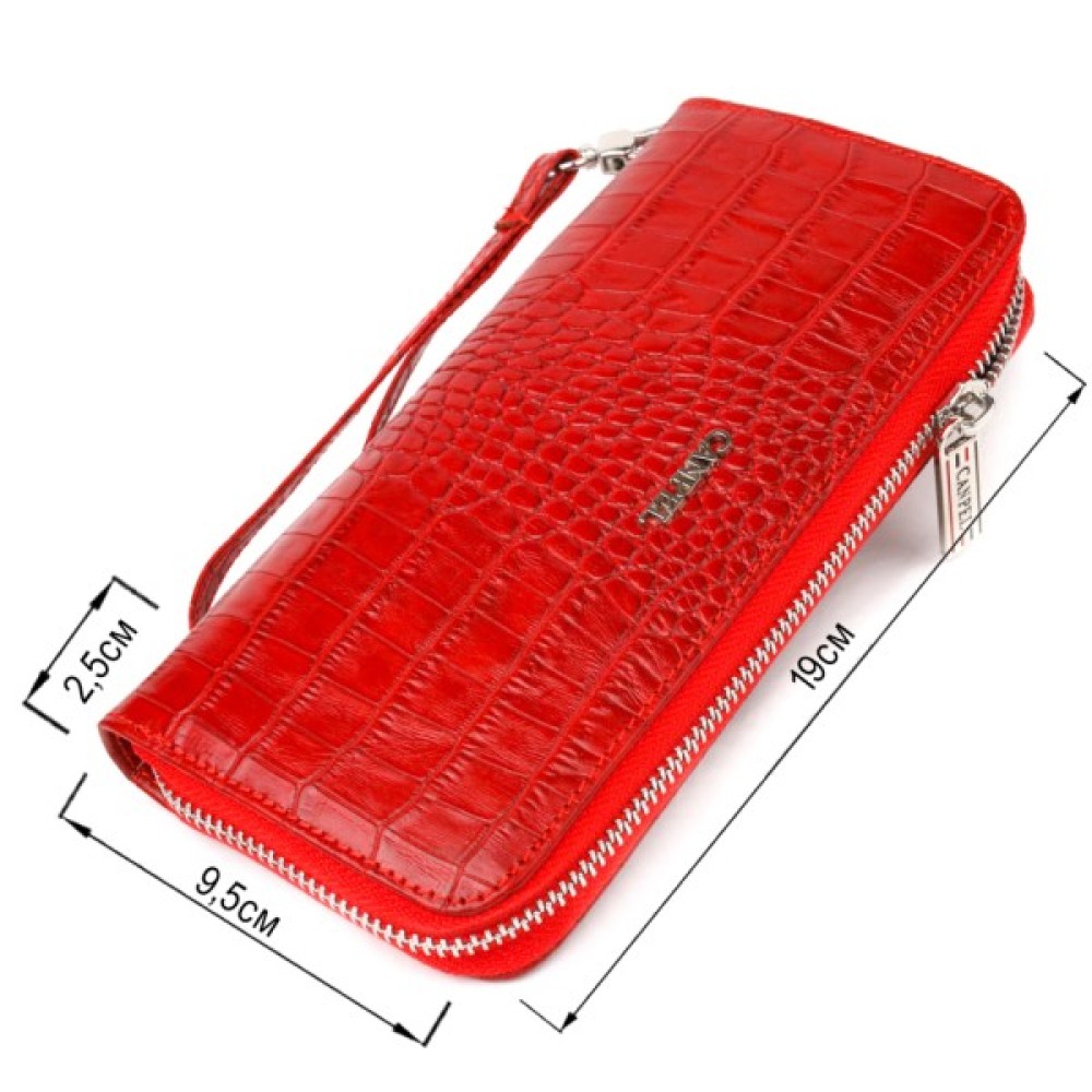 Чудовий жіночий гаманець з натуральної шкіри з тисненням під крокодила. Аксесуар має три основні відділення, в які поміщаються купюри всіх номіналів, дві перегородки, одна з них на блискавці, вісім кишень для карток, дві прилеглі кишені та знімний кистьовий ремінь.