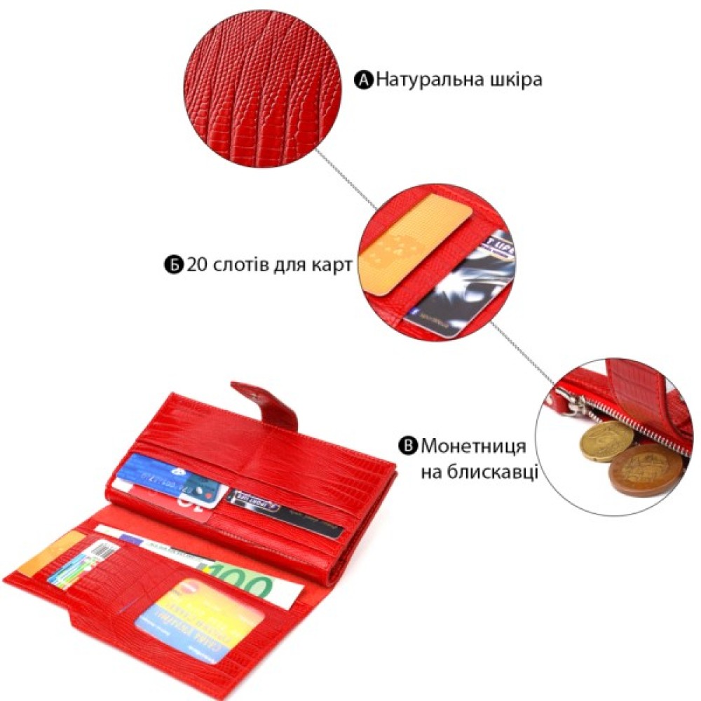 Аксесуар має шість прилеглих кишень, у які помістяться купюри всіх номіналів, містку монетницю та двадцять кишень для карток.