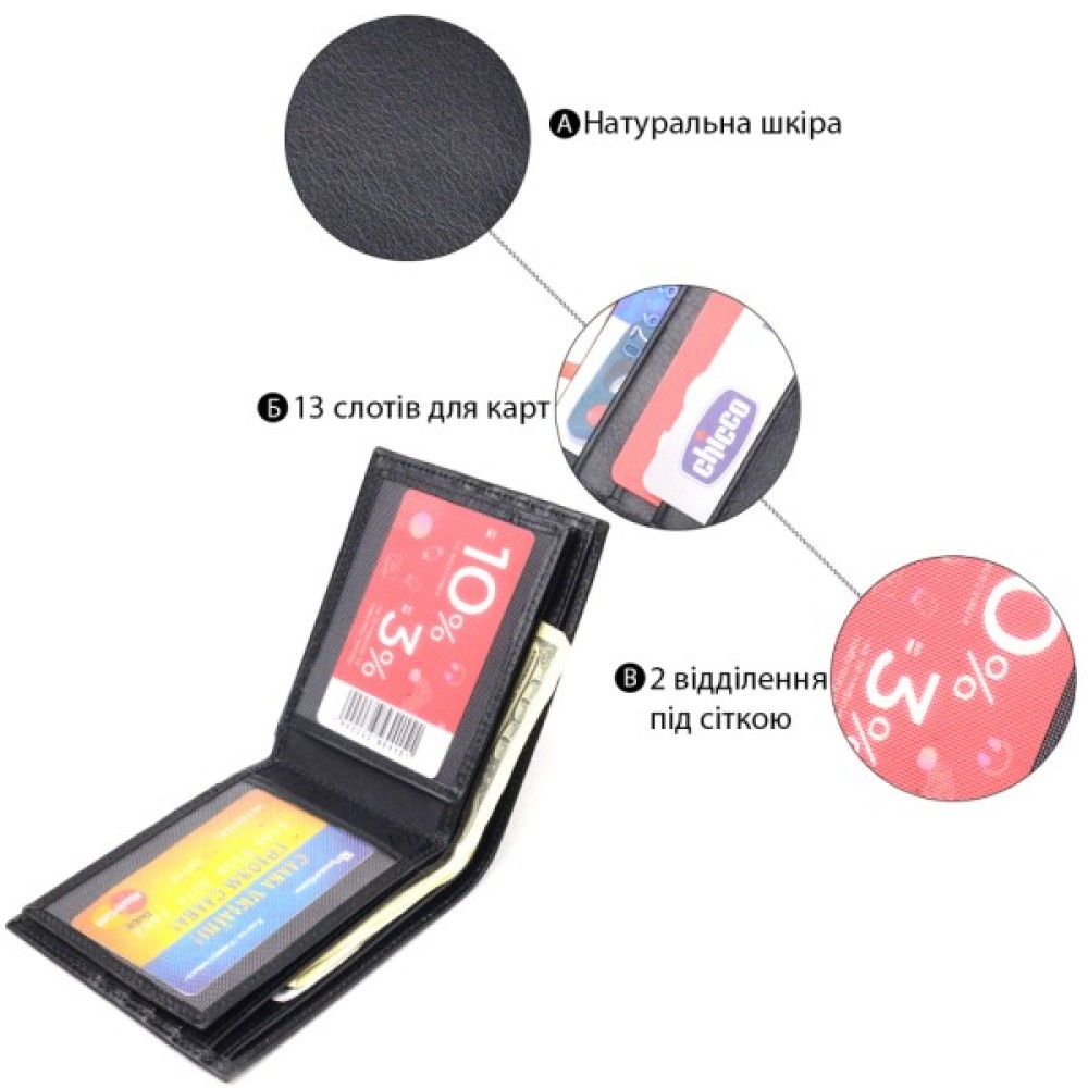 Аксесуар має два відділення для купюр, у які вміщуються купюри всіх номіналів, два прилеглі кишені, а також тринадцять відсіків для карток, один з них — з сіткою.
