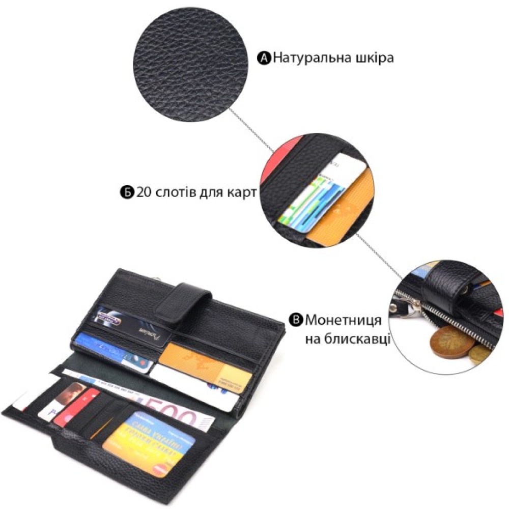 Аксесуар має шість прилеглих кишень, у які помістяться купюри всіх номіналів, містку монетницю та двадцять кишень для карток.