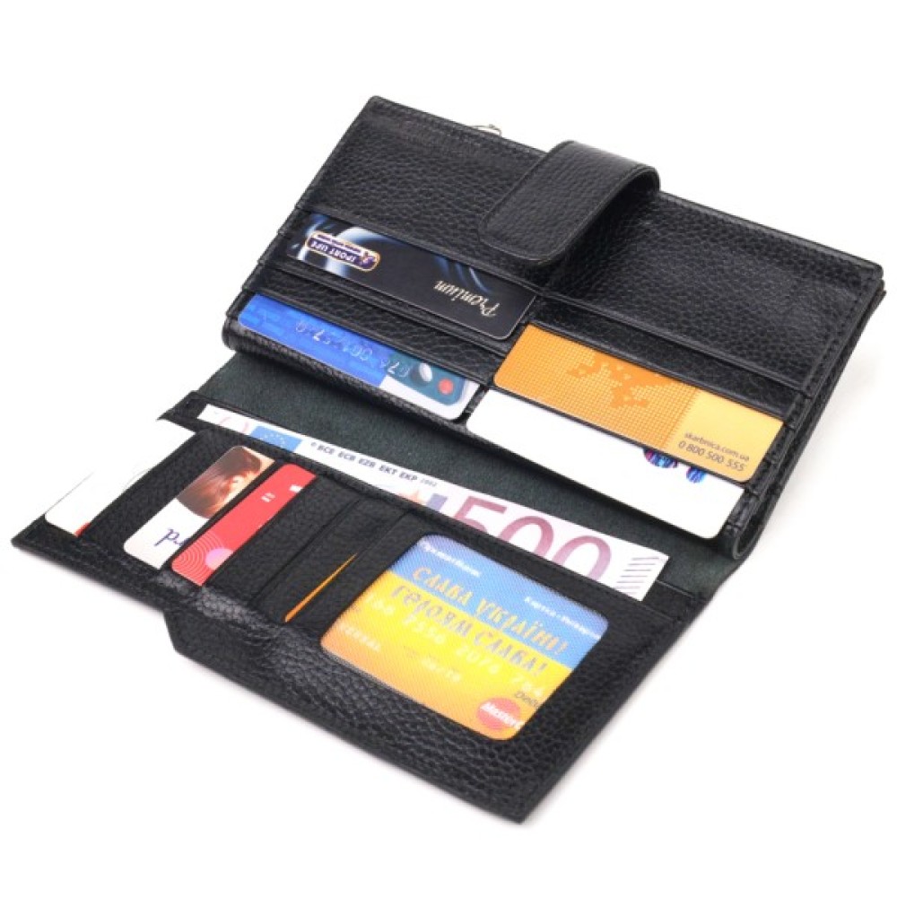 прозоре ID-віконце; подвійне складання; закривається на хлястик з кнопкою; прилеглі кишені; з монетницею; для карт