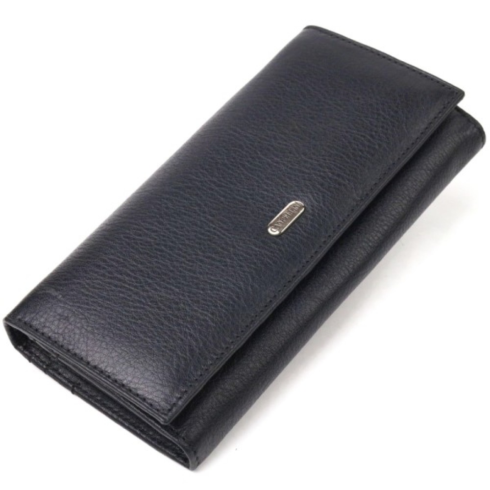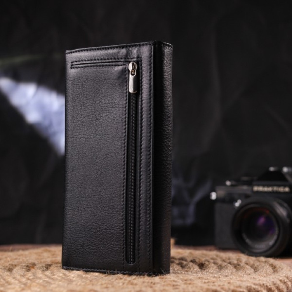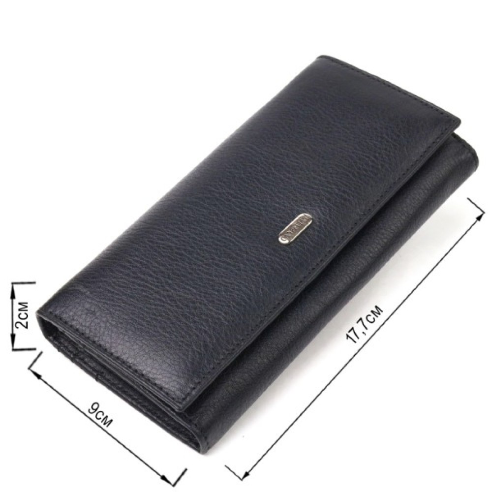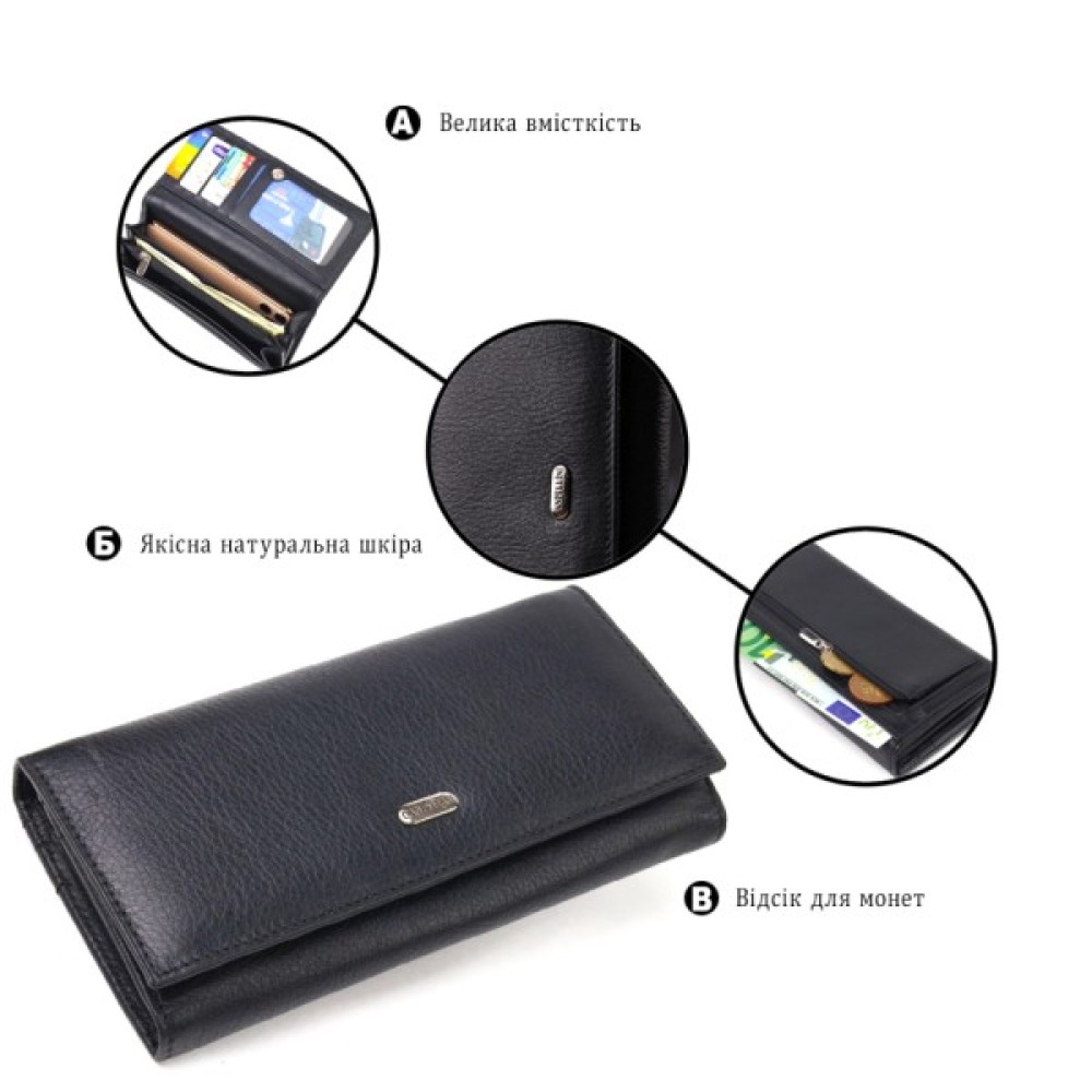 Класичний жіночий гаманець із натуральної шкіри. Аксесуар має три широкі відділення для купюр з двома перегородками (одна з яких на блискавці), містку монетницю зовні, чотири приховані кишені та шість кишень для карток. Закривається аксесуар клапаном на кнопку.