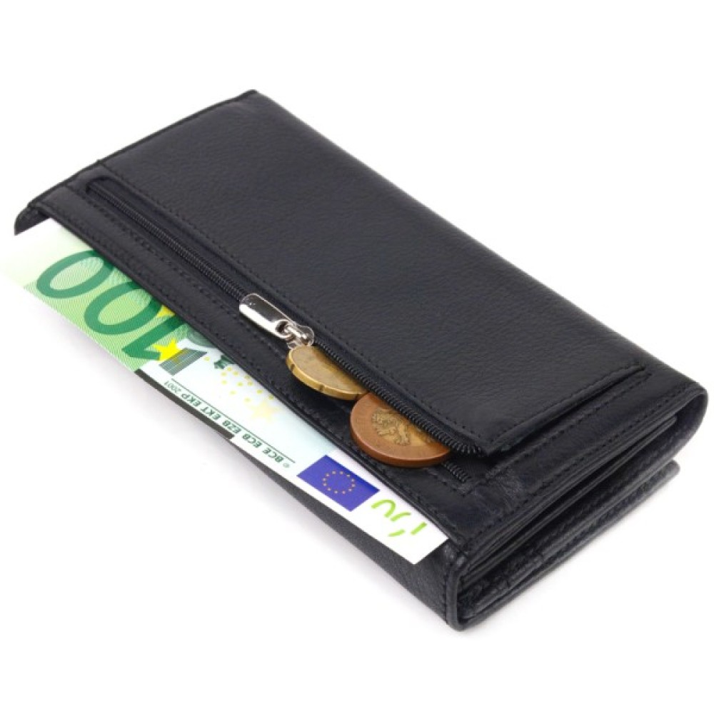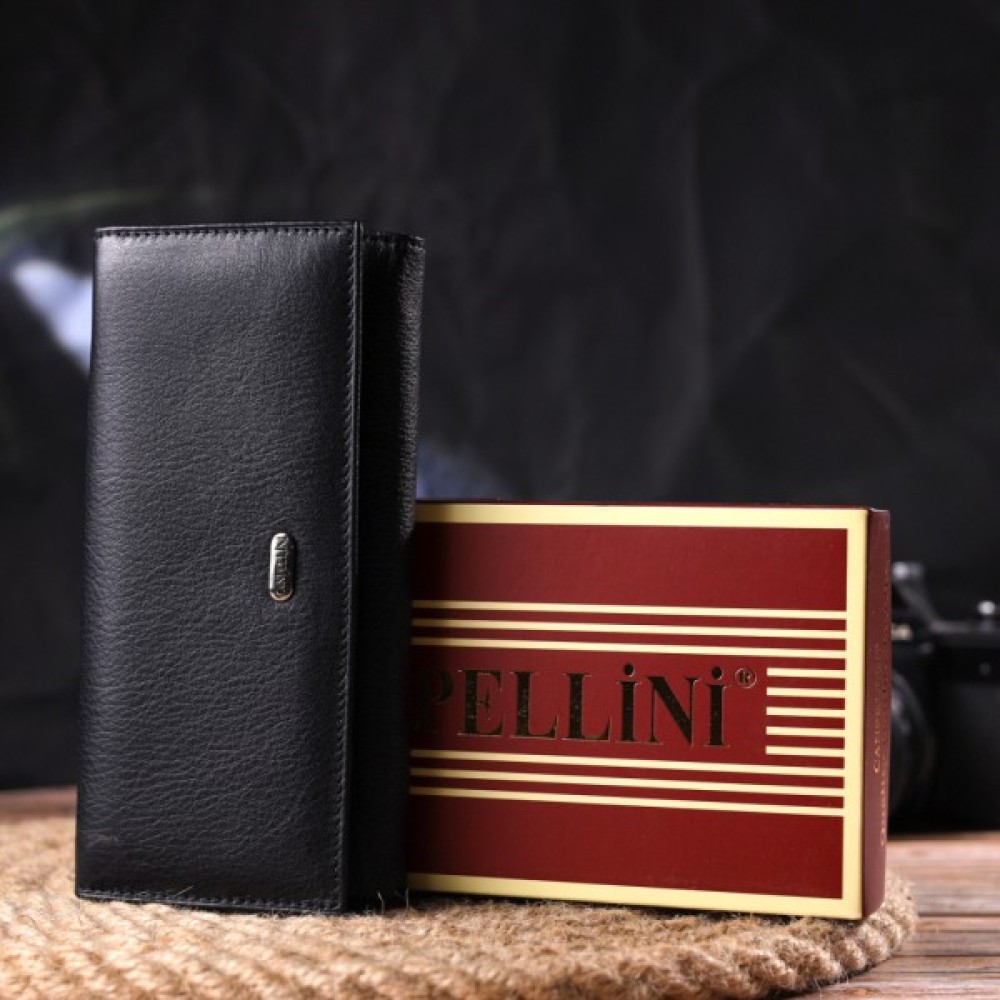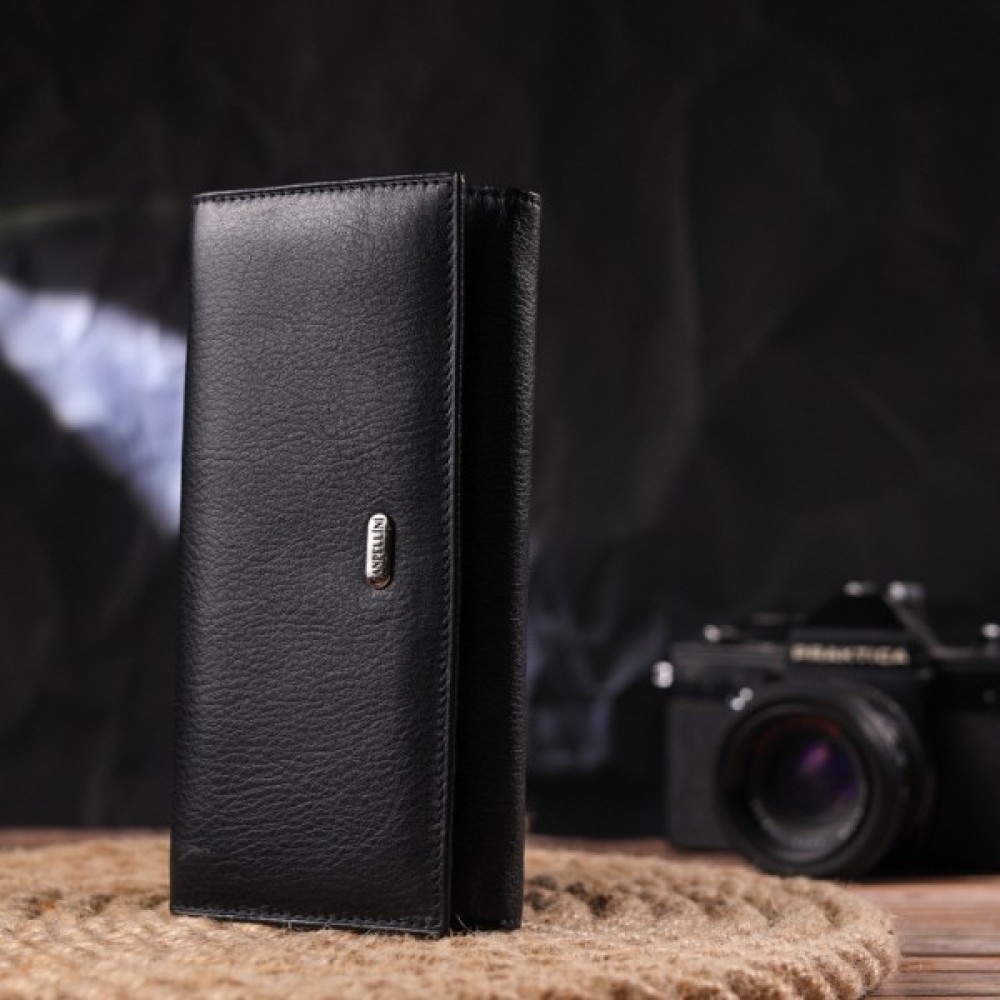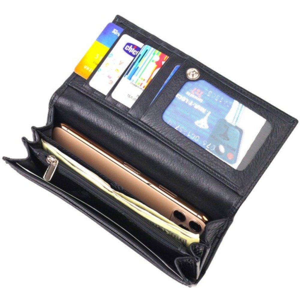 Класичний жіночий гаманець із натуральної шкіри. Аксесуар має три широкі відділення для купюр з двома перегородками (одна з яких на блискавці), містку монетницю зовні, чотири приховані кишені та шість кишень для карток. Закривається аксесуар клапаном на кнопку.