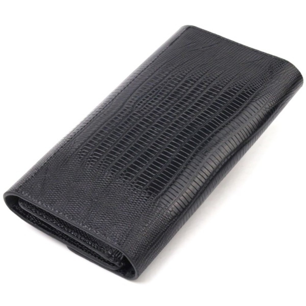 Цікавий жіночий гаманець з натуральної шкіри з тисненням під рептилію. Аксесуар має три відділення для купюр, монетницю на блискавці, дві приховані кишені та дванадцять кишень для карток.