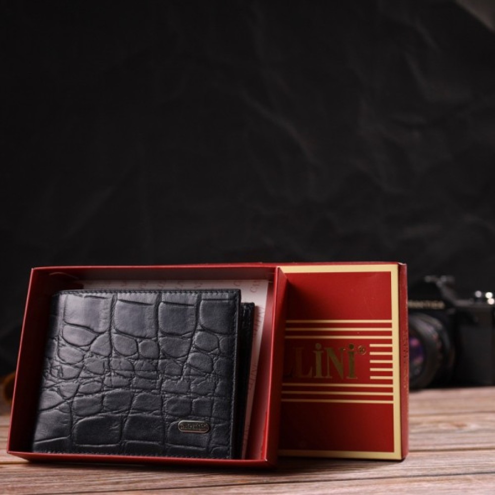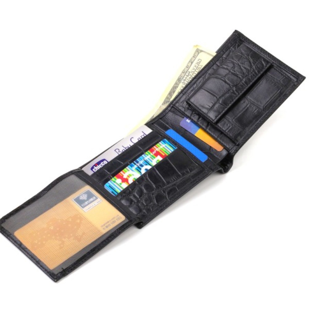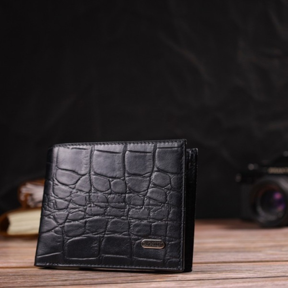 Практичний чоловічий гаманець у чорному кольорі з натуральної шкіри з тисненням під крокодила. Аксесуар має одне основне відділення з перегородкою, в яке поміщаються купюри всіх номіналів, чотири кишені для карток, дві кишені під сіточкою для документів, монетницю та три прилеглі кишені.