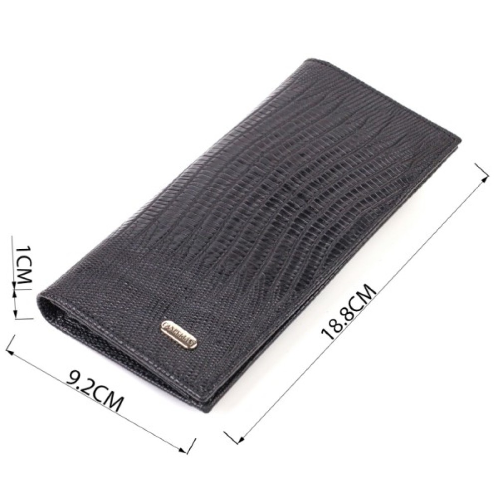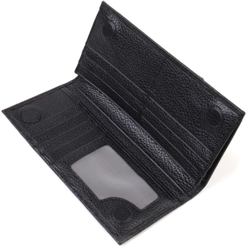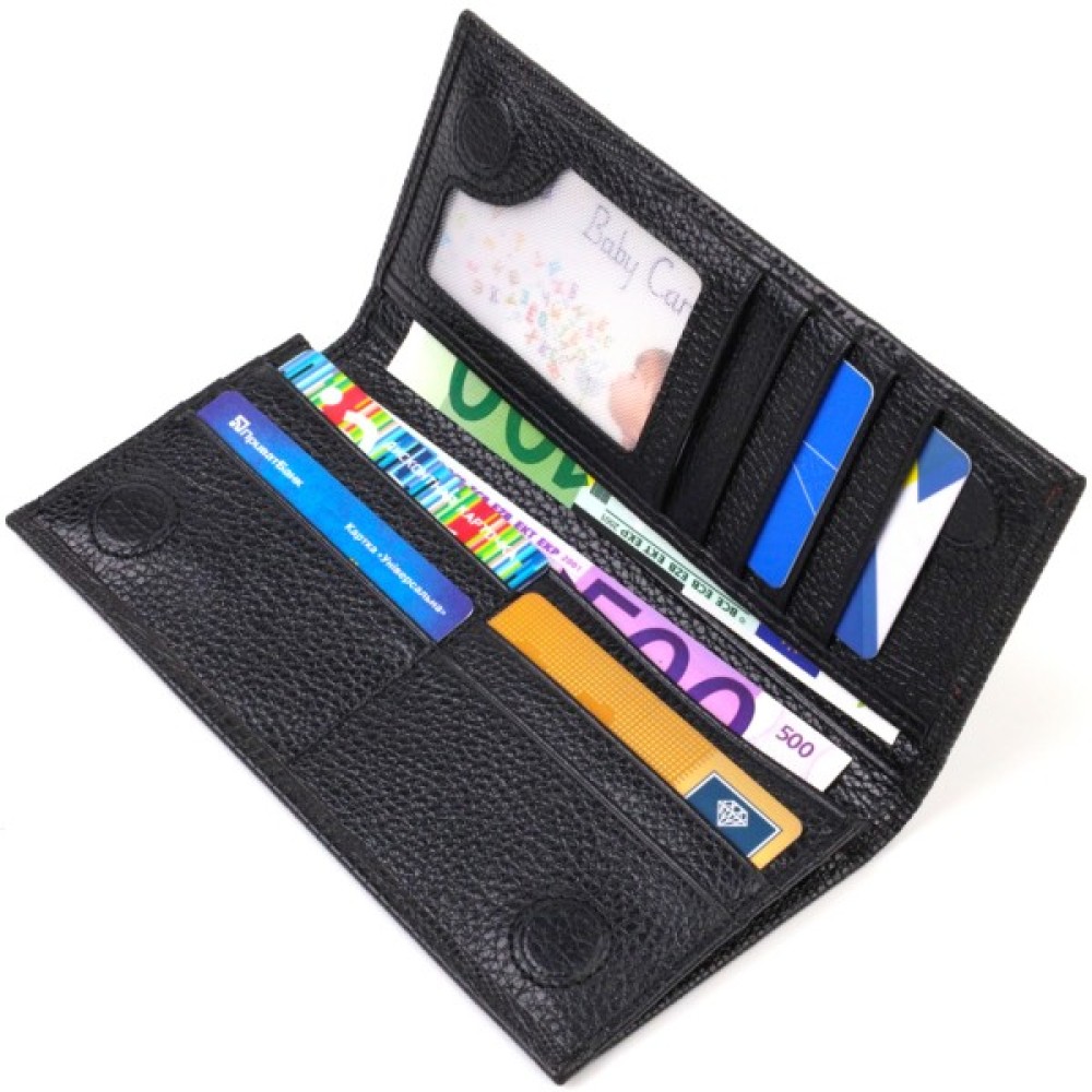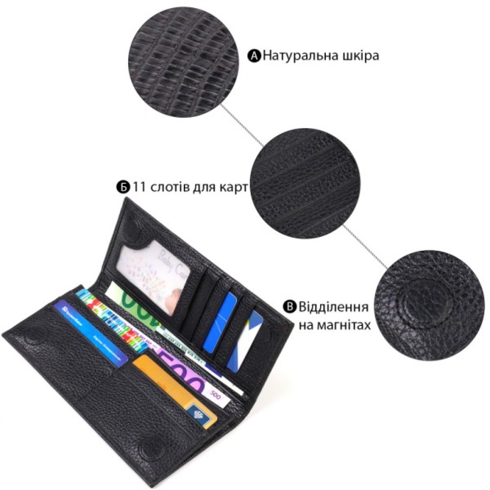 Аксесуар має одне основне відділення для купюр усіх номіналів, 11 осередків для карток, кишеню під сіточкою для пропуску, дві приховані кишені та монетницю на блискавці.