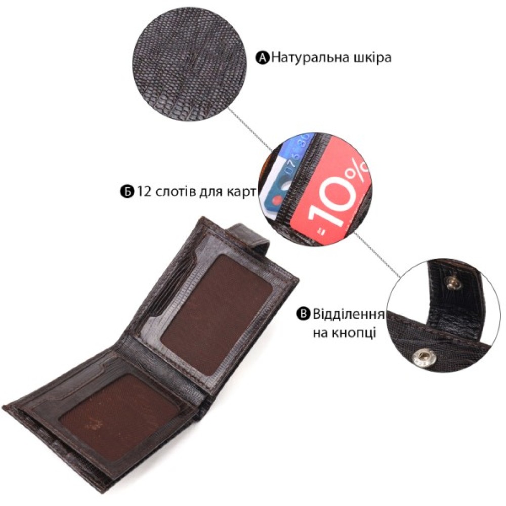 Компактний лаковий портмоне з натуральної фактурної шкіри, з тисненням під рептилію. Аксесуар має одне основне відділення з перегородкою, в якому розміщуються купюри всіх номіналів, дванадцять кишень для карток, чотири з яких — під сіточкою.