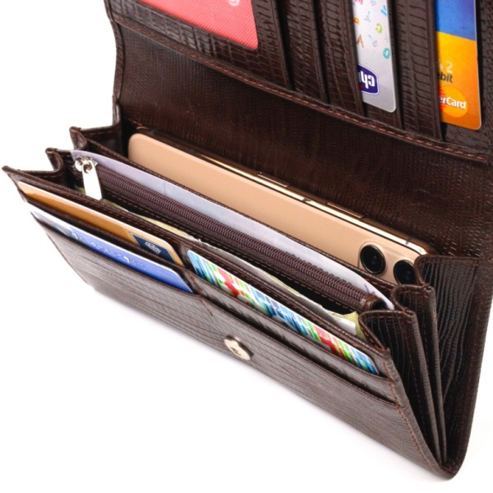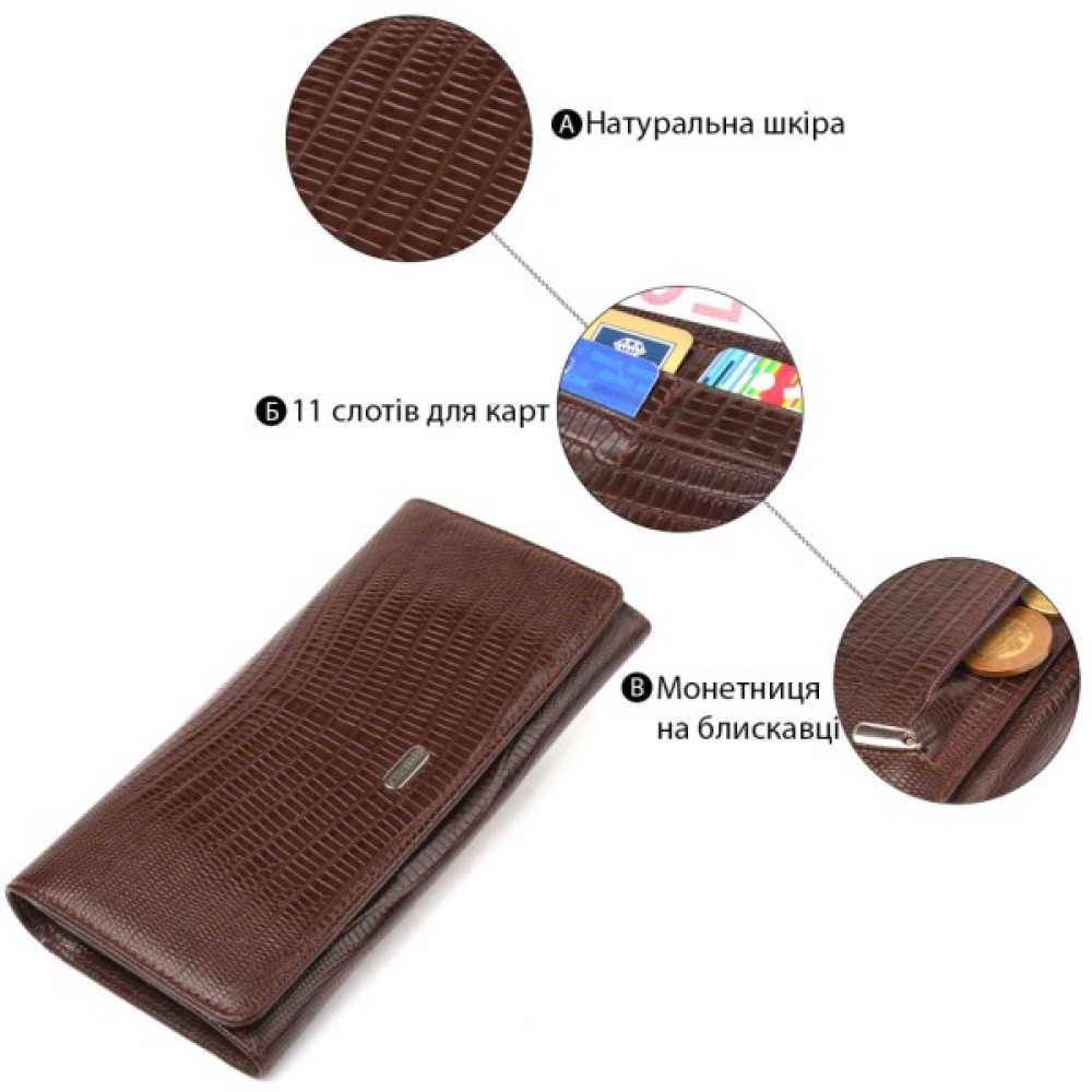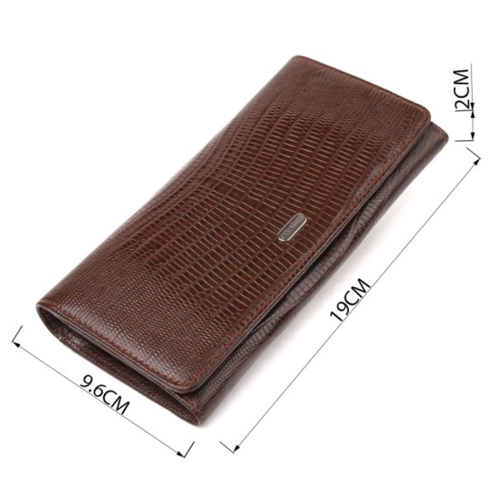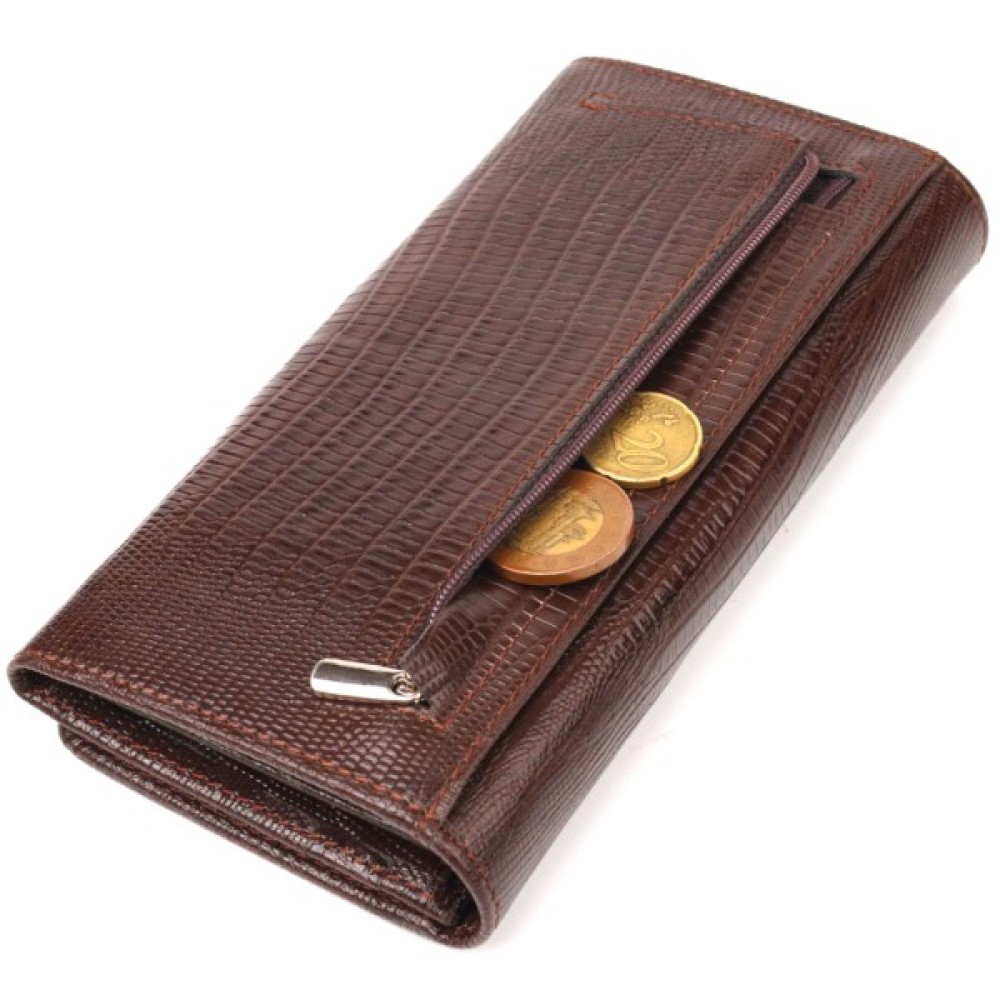 Стильний фактурний жіночий гаманець з натуральної шкіри з тисненням під рептилію. Аксесуар має три основні відділення, в які поміщаються купюри всіх номіналів, дві перегородки (одна з них на блискавці), одинадцять кишень для карток, одна з яких під сіточкою, монетниця на блискавці зовні та одна прилегла кишеня.