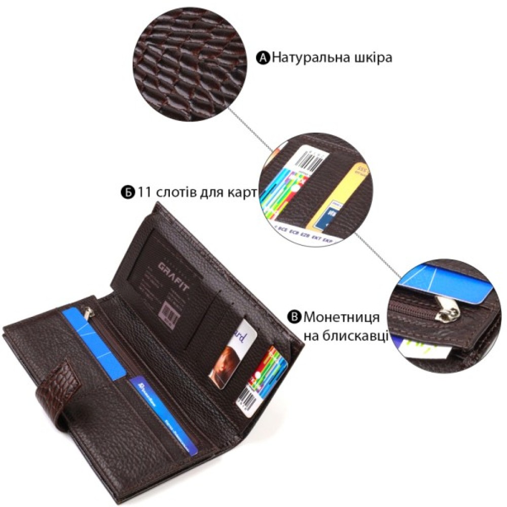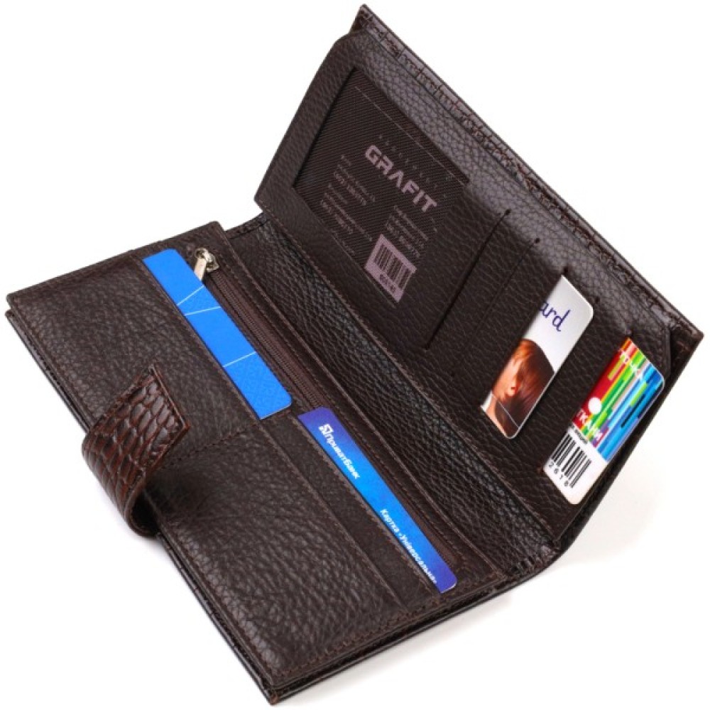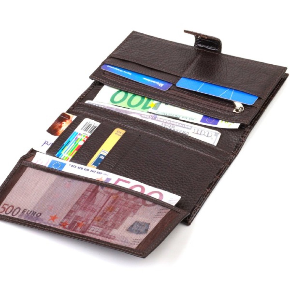 Аксесуар має одне основне відділення для купюр усіх номіналів, одинадцять осередків для карток, кишеню під сіточкою для пропуску та дві приховані кишені.