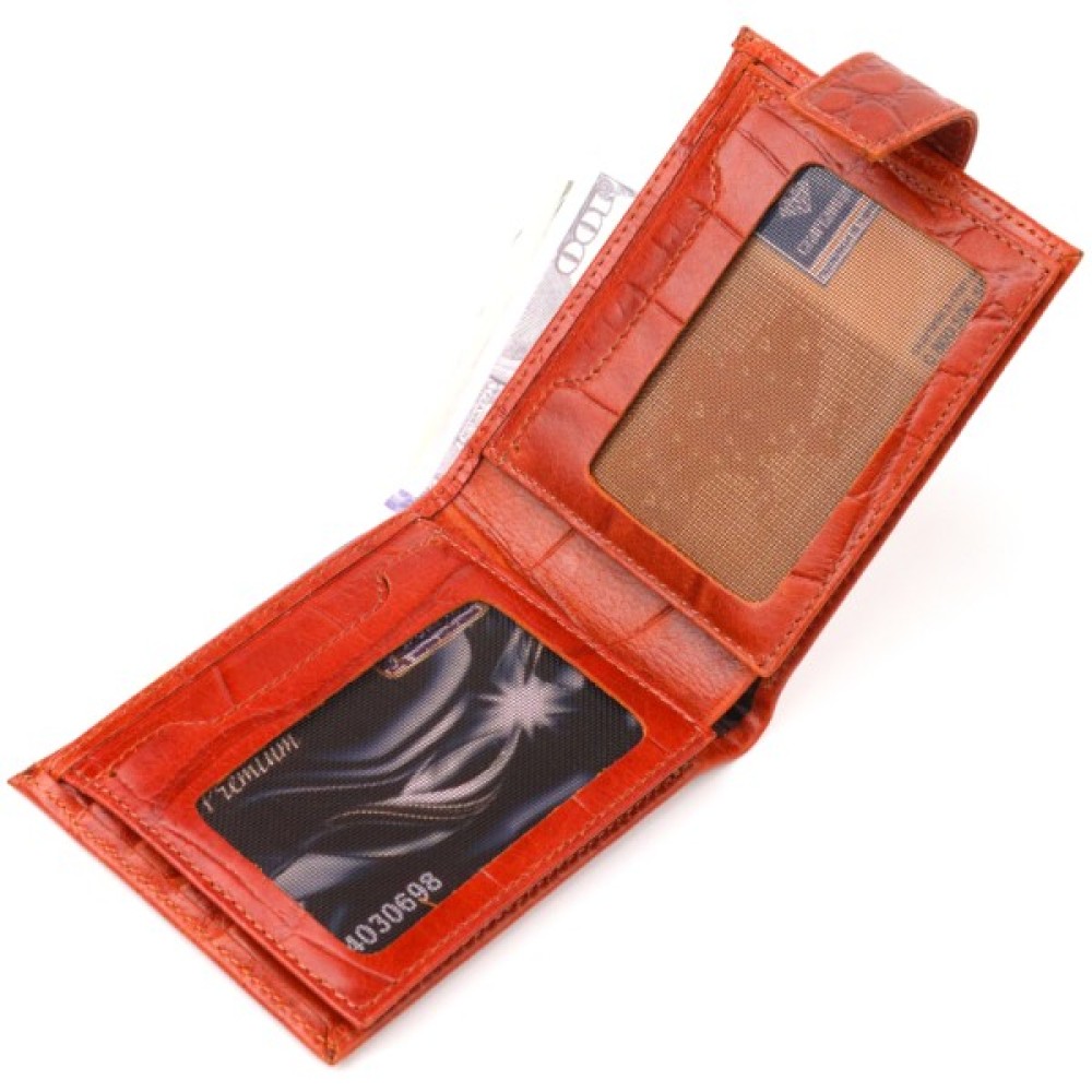 Красиве чоловіче портмоне з натуральної фактурної шкіри з тисненням під крокодила. Аксесуар має одне основне відділення з перегородкою, в якому розміщуються купюри всіх номіналів, дванадцять кишень для карток, чотири з яких — під сіточкою.