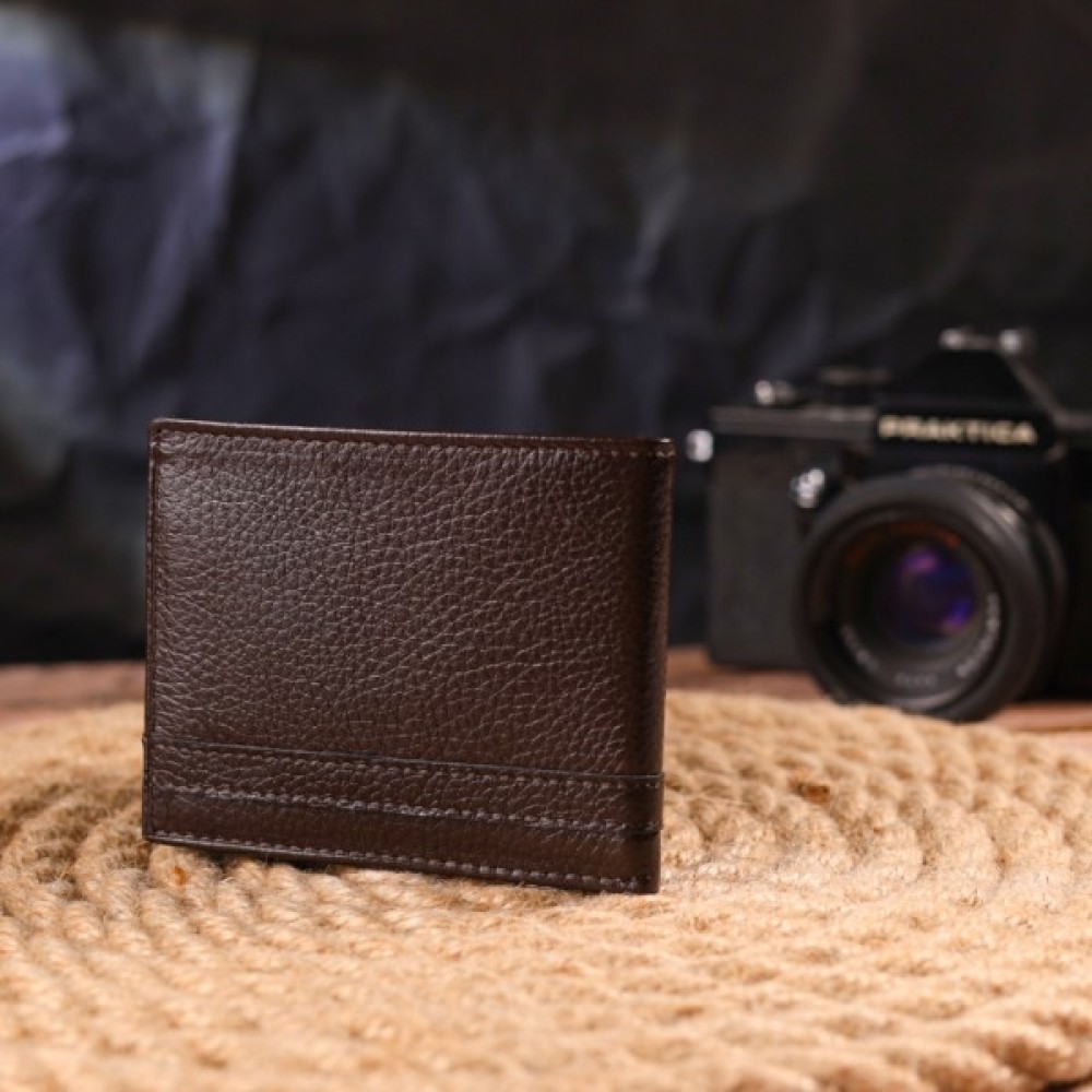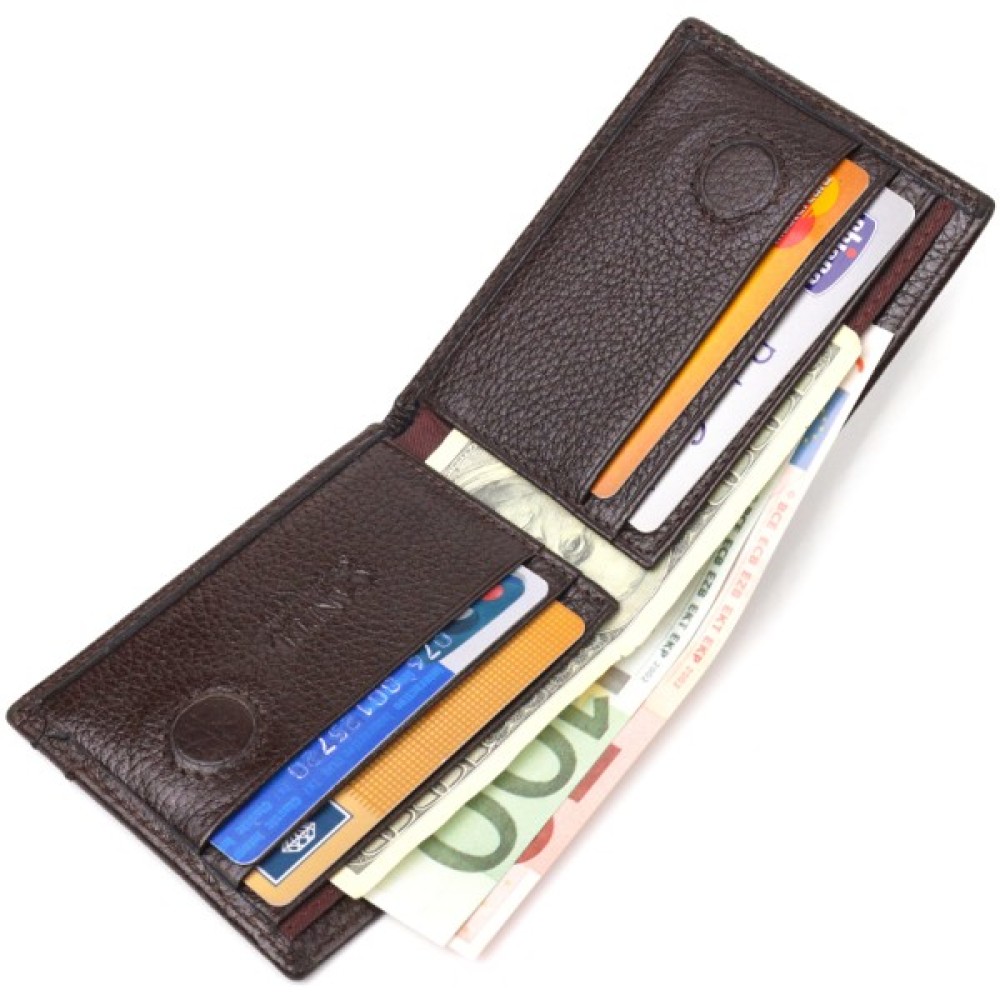 Відмінний затискач для купюр із натуральної зернистої шкіри у красивому коричневому кольорі. Аксесуар має одне основне відділення, в якому розміщуються купюри всіх номіналів, два куточки – власники для купюр, чотири осередки для кредитних карток.